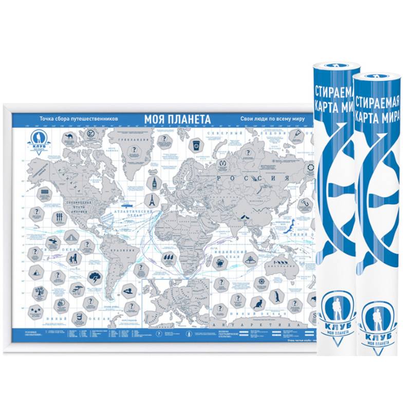 Скретч-карта мира "Моя планета" 59х42см.Белая/круглый тубус/,стир.слой-Серебро| Издательство | Умный подарок |
