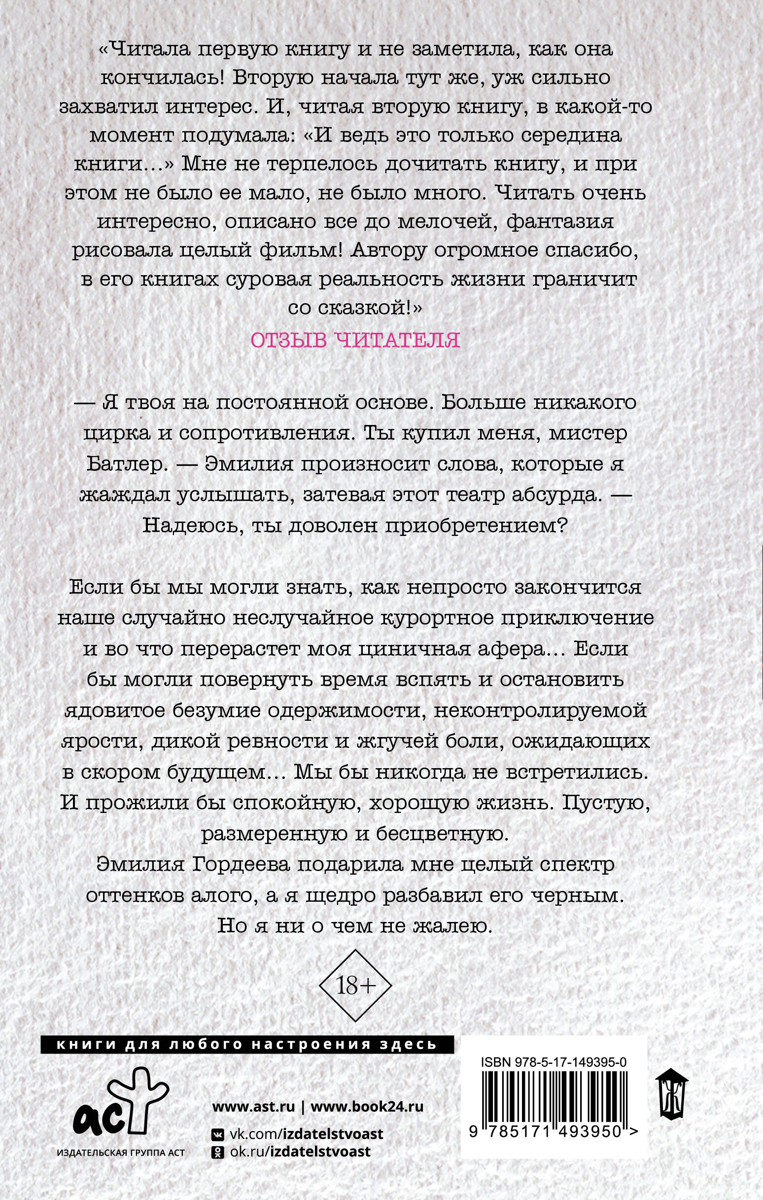 - Я твоя на постоянной основе. Больше никакого цирка и сопротивления. Ты купил меня, мистер Батлер. - Эмилия произносит слова, которые я жаждал услышать, затевая этот театр абсурда. - Надеюсь, ты доволен приобретением? Если бы мы могли знать, как непросто закончится наше случайно неслучайное курортное приключение и во что перерастет моя циничная афера… Если бы могли повернуть время вспять и остановить ядовитое безумие одержимости, неконтролируемой ярости, дикой ревности и жгучей боли, ожидающих в скором будущем… Мы бы никогда не встретились. И прожили бы спокойную хорошую жизнь. Пустую, размеренную и бесцветную. Эмилия Гордеева подарила мне целый спектр оттенков алого, а я щедро разбавил его черным. Но я ни о чем не жалею.| Издательство | АСТ |