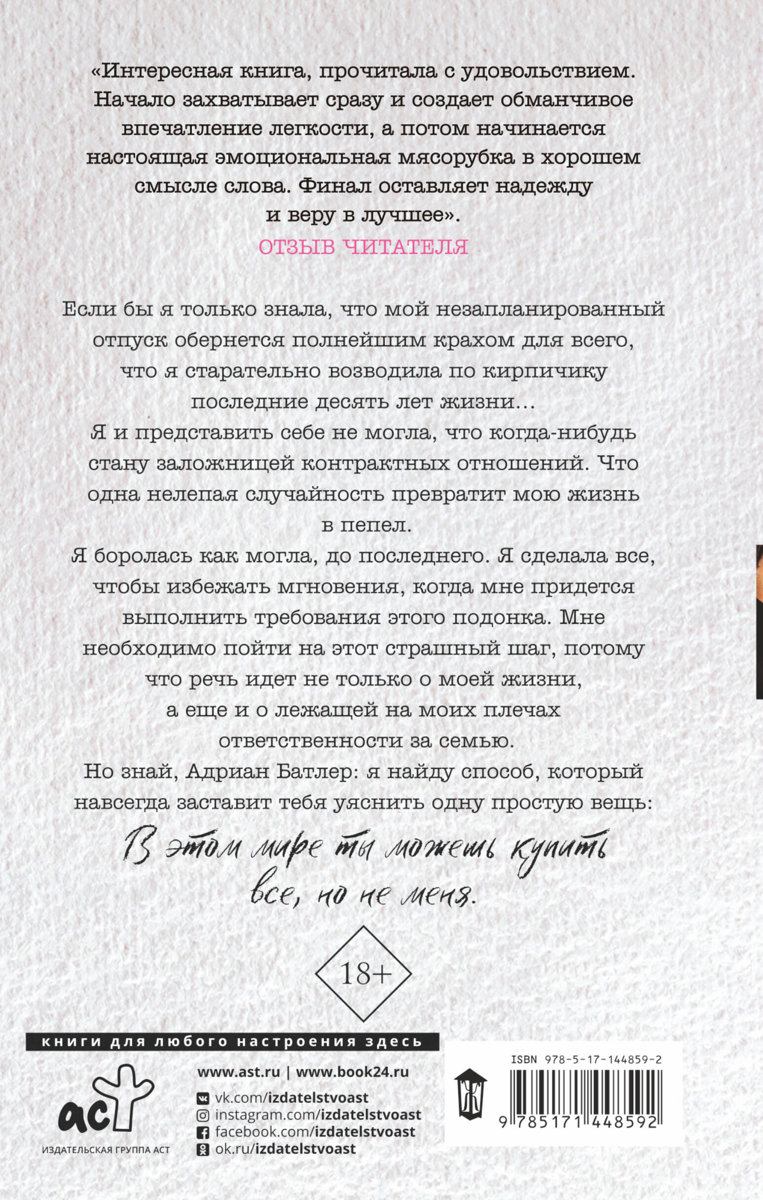 Если бы я только знала, что мой незапланированный отпуск обернется полнейшим крахом для всего, что я старательно возводила по кирпичику последние десять лет жизни… Я и представить себе не могла, что когда-нибудь стану заложницей контрактных отношений. Что одна нелепая случайность превратит мою жизнь в пепел. Я боролась как могла, до последнего. Я сделала все, чтобы избежать мгновения, когда мне придется выполнить требования этого подонка. Мне необходимо пойти на этот страшный шаг, потому что речь идет не только о моей жизни, а еще и о лежащей на моих плечах ответственности за семью. Но знай, Адриан Батлер: я найду способ, который навсегда заставит тебя уяснить одну простую вещь: В этом мире ты можешь купить все, но не меня.| Издательство | ИЗДАТЕЛЬСТВО "АСТ" |