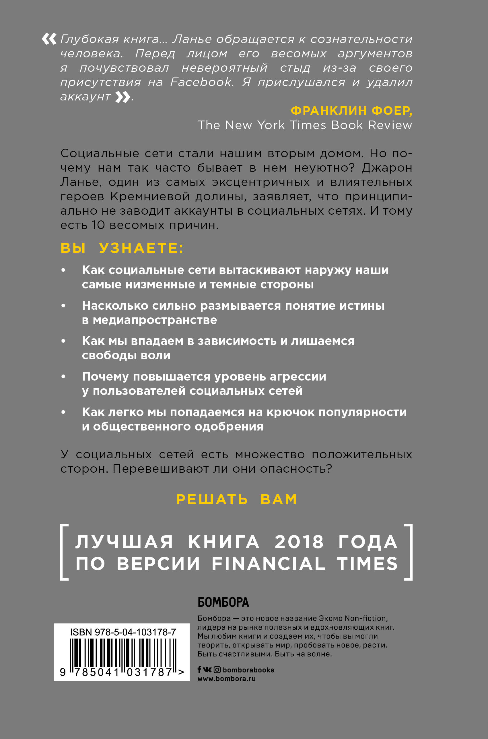 Лучшая книга 2018 года по версии Financial Times. Социальные сети стали нашим вторым домом. Но почему нам так часто бывает в нем неуютно? Джарон Ланье, один из самых эксцентричных и влиятельных героев Кремниевой долины, заявляет, что принципиально не заводит аккаунты в социальных сетях. И тому есть 10 весомых причин. В своей провокационной книге Ланье рассказывает: - Как социальные сети вытаскивают наружу наши самые низменные и темные стороны. - Насколько сильно размывается понятие истины в медиапространстве. - Как мы впадаем в зависимость и лишаемся свободы воли. - Почему повышается уровень агрессии у пользователей социальных сетей. - Как легко мы попадаемся на крючок популярности и общественного одобрения. У социальных сетей есть множество положительных сторон. Перевешивают ли они опасность? Решать вам.| Издательство | ООО "Издательство "Эксмо" |