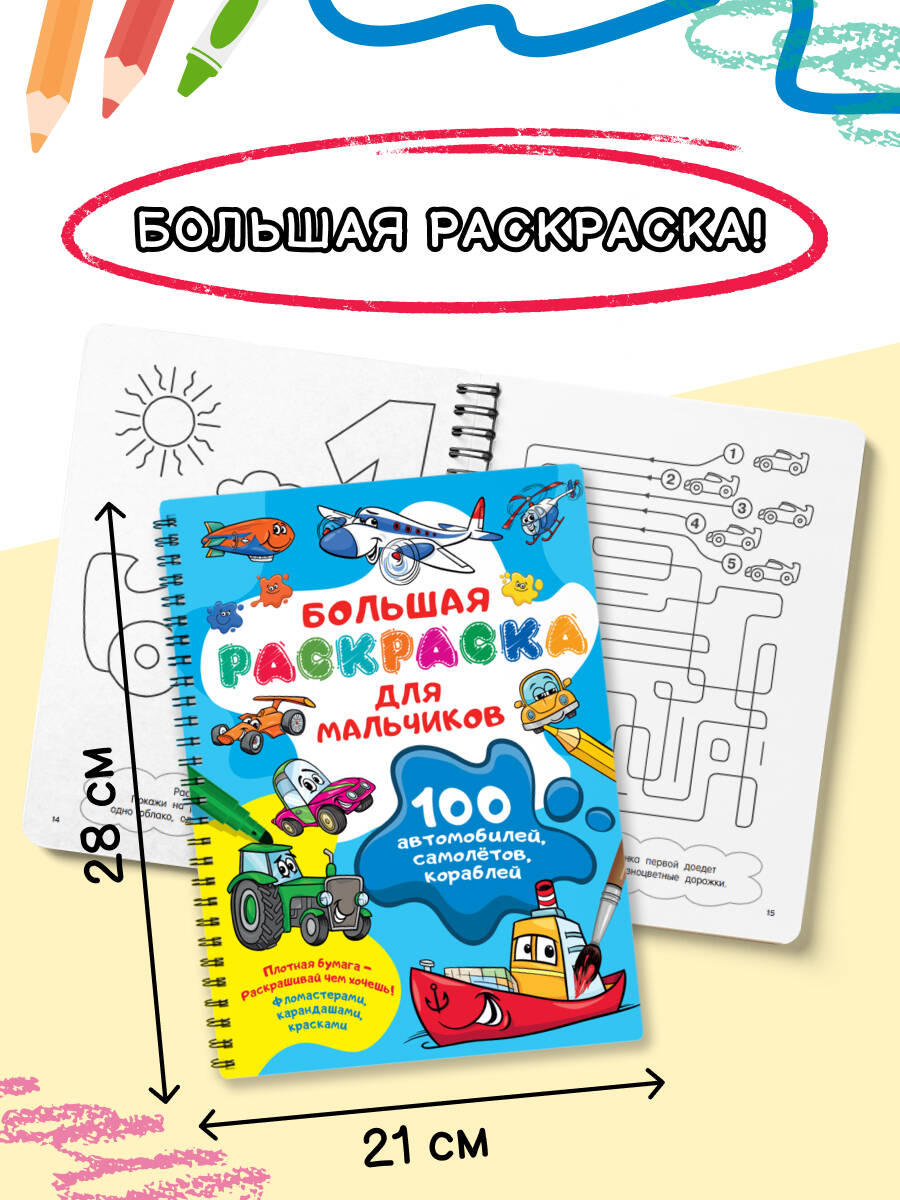 Все дети любят рисовать! Эту замечательную раскраску на спирали можно взять с собой в детский сад, на праздник, к друзьям в гости, в поездку - благодаря спирали страницы легко перекидываются из стороны в сторону. Картинки можно раскрашивать карандашами или фломастерами, можно одному или компанией, можно 15-20 минут или несколько часов. В любом случае получится неповторимый шедевр. Классная большая раскраска - универсальная замена гаджетам: • Суперудобная раскраска на спирали - страницы открываясь на 360 градусов. • Чёткий контур, крупные картинки, белая бумага отличного качества. • Раскрашивать машинки, кораблики, самолётики и другую технику интересно и очень полезно - ребята разовьют творческие способности и художественный вкус, мелкую моторику и координацию движений руки, зрительное восприятие и внимание. • Мальчишки научатся раскрашивать, не выходя за контуры картинки, постараются быть внимательными и аккуратными. • Простые и интересные задания помогают развить трудолюбие, собранность и упорство - нужно приложить усилия, чтобы страница раскраски превратилась в законченную работу.| Издательство | Издательство "АСТ" |