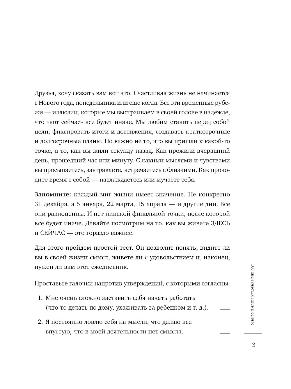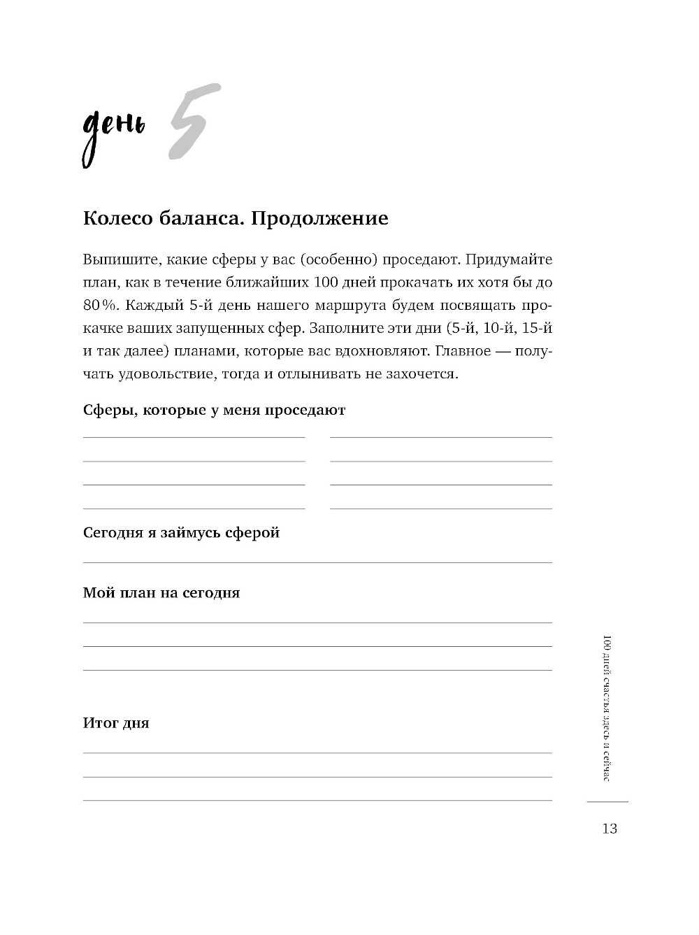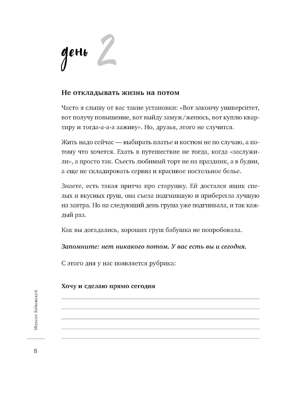 «100 дней счастья здесь и сейчас» - это ежедневник от автора бестселлера «Хочу и буду», популярного психолога Михаила Лабковского. В ежедневнике вас ждут: вдохновляющие тексты о счастье от Лабковского на каждый день; вопросы и задания, которые помогут понять, что мешает вам быть счастливым; тесты для диагностики эмоционального состояния и колесо баланса Пола Майера; привычки счастливого человека; комиксы с «нездоровым» и «здоровым» подходом к жизни; трекеры сна, маленьких достижений и проявлений заботы о себе. И многое-многое другое.| Издательство | Эксмо |
