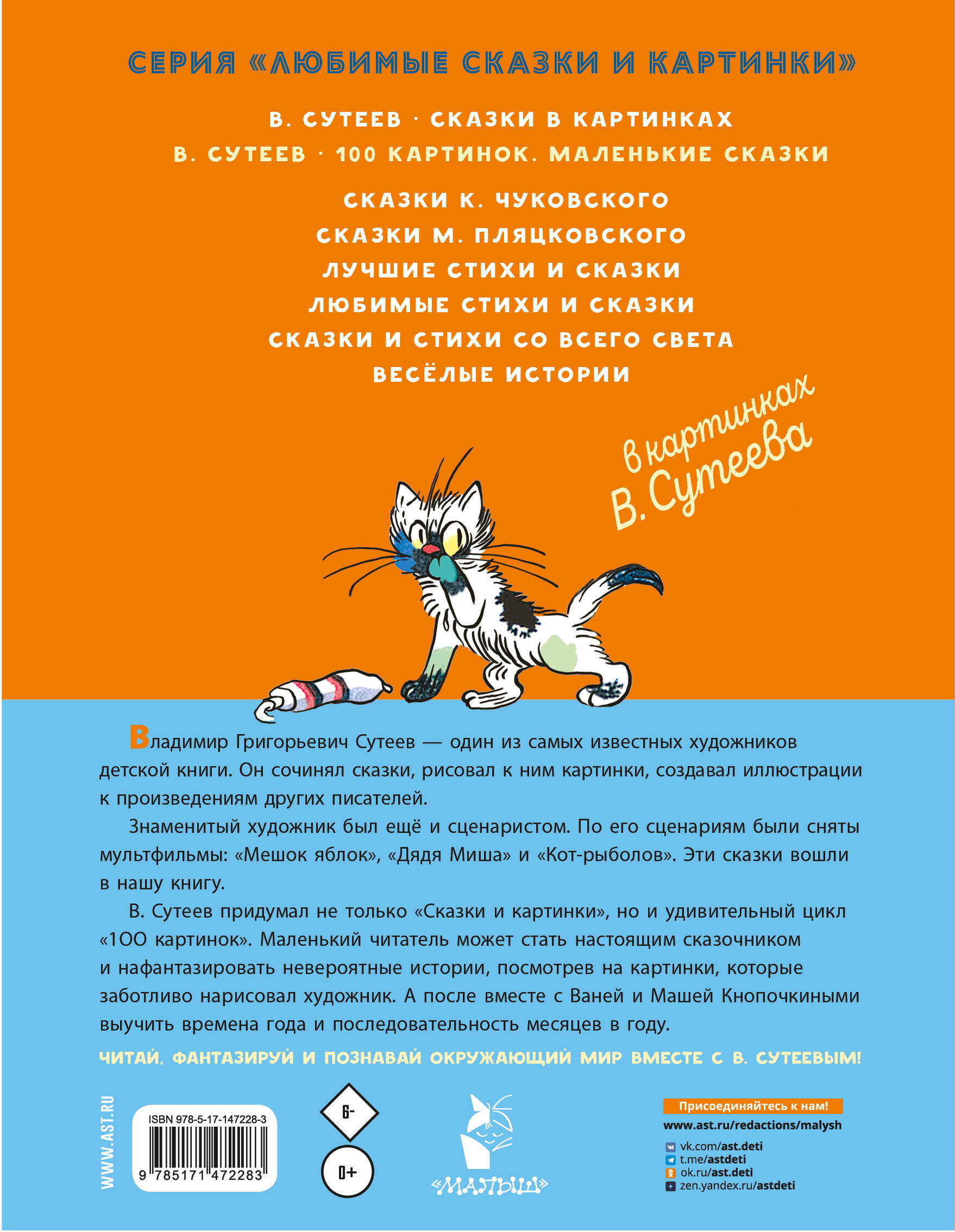 Владимир Григорьевич Сутеев - один из самых известных художников детской книги. Он сочинял сказки, рисовал к ним картинки, создавал иллюстрации к произведениям других писателей. Знаменитый художник был ещё и сценаристом. По его сценариям были сняты мультфильмы: «Мешок яблок», «Дядя Миша» и «Кот-рыболов». Эти сказки вошли в нашу книгу. В. Сутеев придумал не только знаменитые «Сказки и картинки», но и удивительный цикл «100 картинок». Маленький читатель может стать настоящим сказочником и нафантазировать невероятные истории, посмотрев на картинки, которые заботливо нарисовал художник. А после вместе с Ваней и Машей Кнопочкиными выучить времена года и последовательность месяцев в году. Читай, фантазируй и познавай окружающий мир вместе с В. Сутеевым!| Издательство | ИЗДАТЕЛЬСТВО "АСТ" |