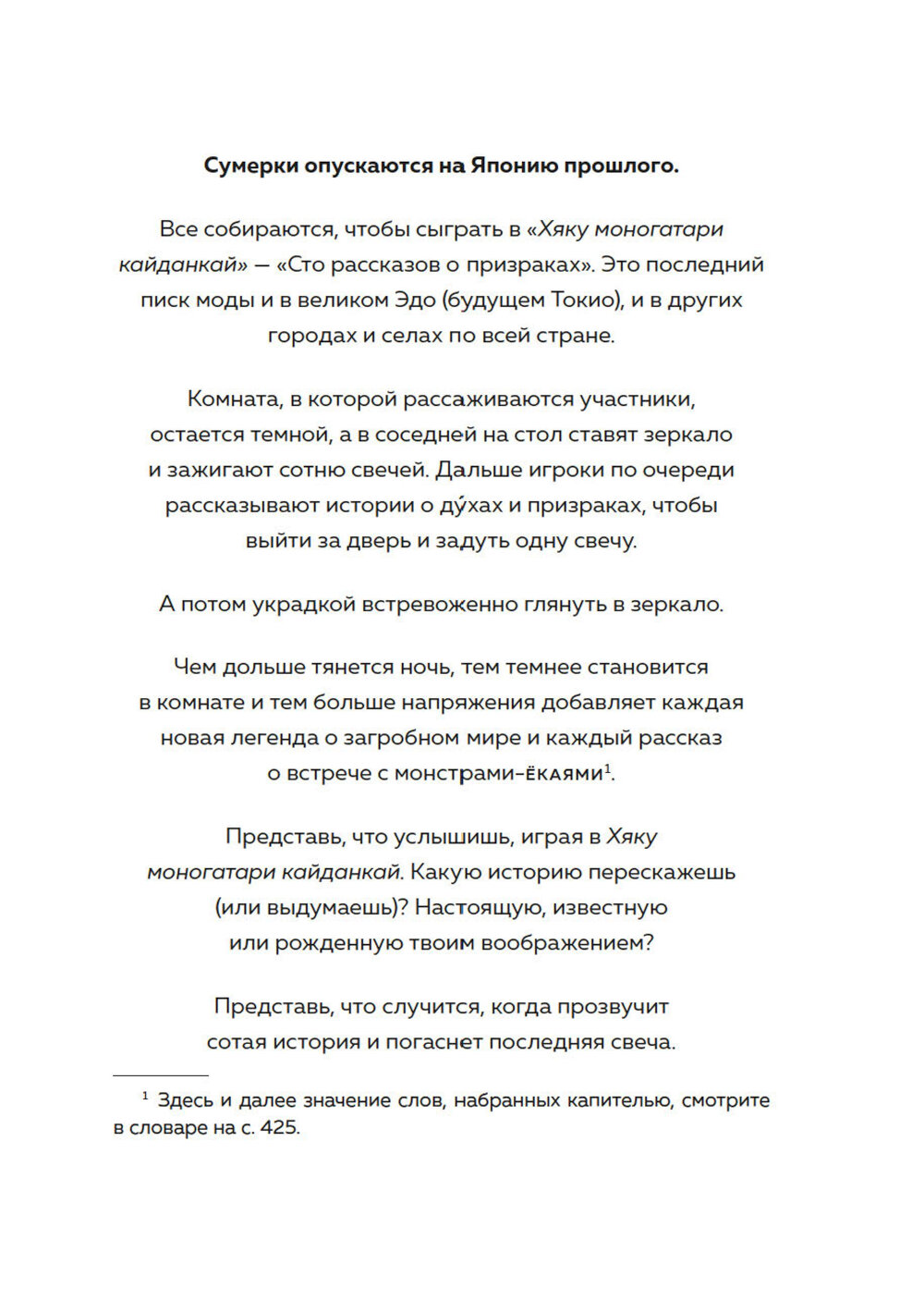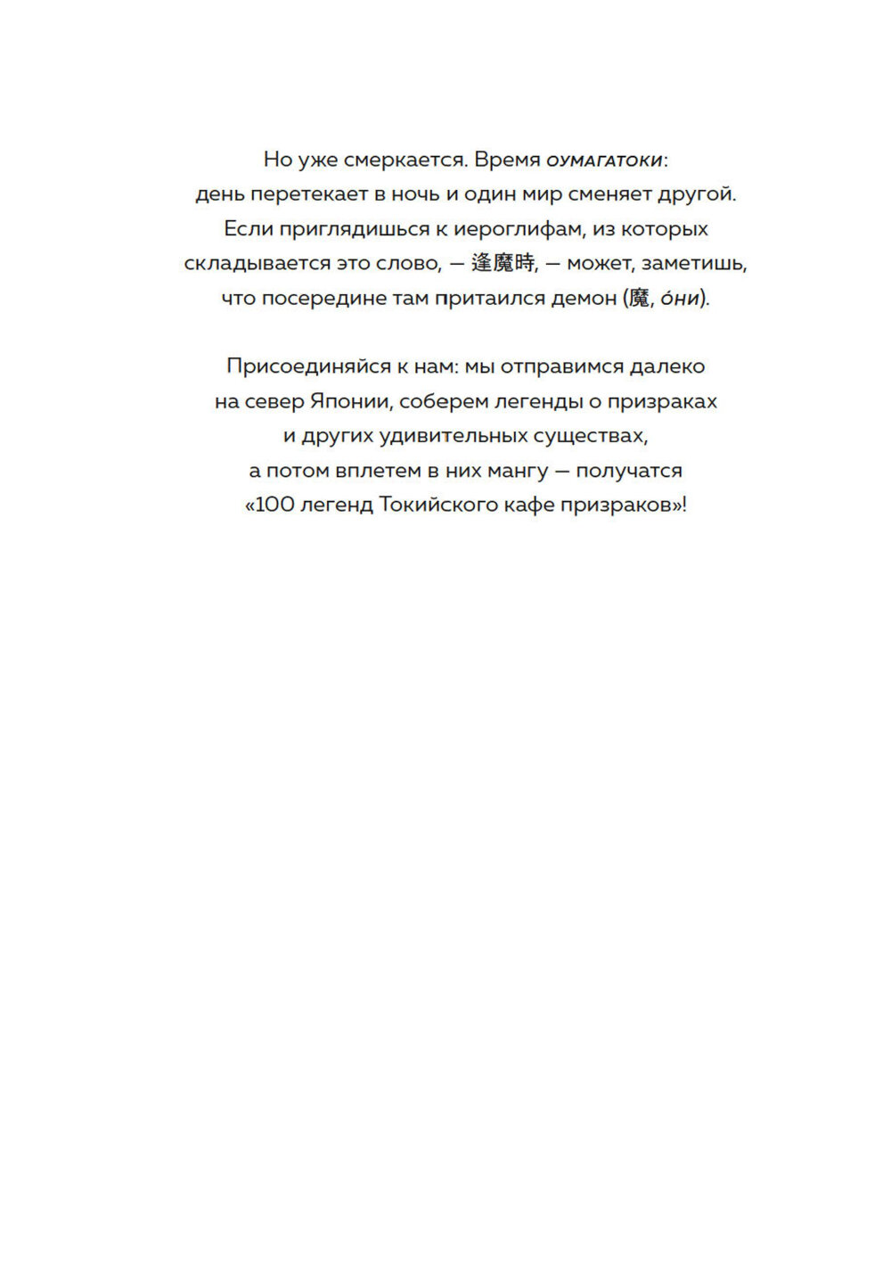 Писатель Джулиан и его подруга, мангака Тиэ, заходят в таинственное кафе со странной управляющей. Там они знакомятся с потерявшимся мальчиком Акирой и решают помочь ему вернуться домой. В этом далеком и опасном путешествии к горе Страха они соберут для своей книги легенды о призраках, оборотнях и других мифических существах, которые в тех местах известны как монстры-ёкаи. Реальность, выдумка, иной мир - в этой истории смешалось все. Бесстрашным путешественникам придется повстречать ёкаев безобидных... и не очень, поесть хрустящей темпуры, пересечь границу потустороннего мира, побывать на Ночном параде ста духов, а также узнать тайну мальчика Акиры. «100 легенд Токийского кафе призраков» - это увлекательный микс прозы и манги, вдохновляющие истории о надежде, любви, потерях... и призраках! И кто знает, возможно, не все истории из этой книги - вымысел!| Издательство | Азбука |