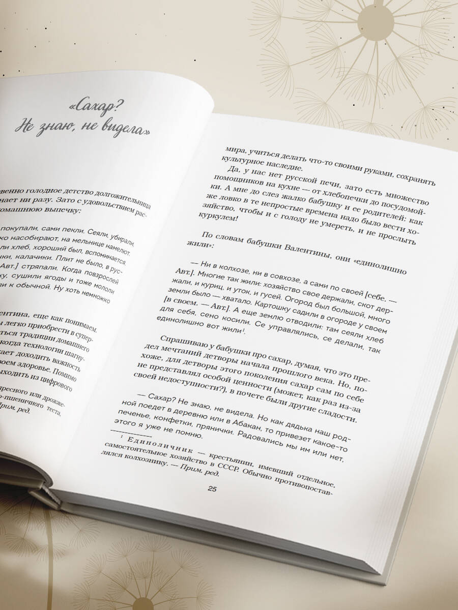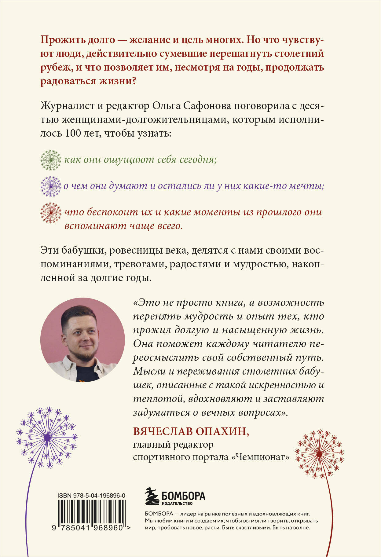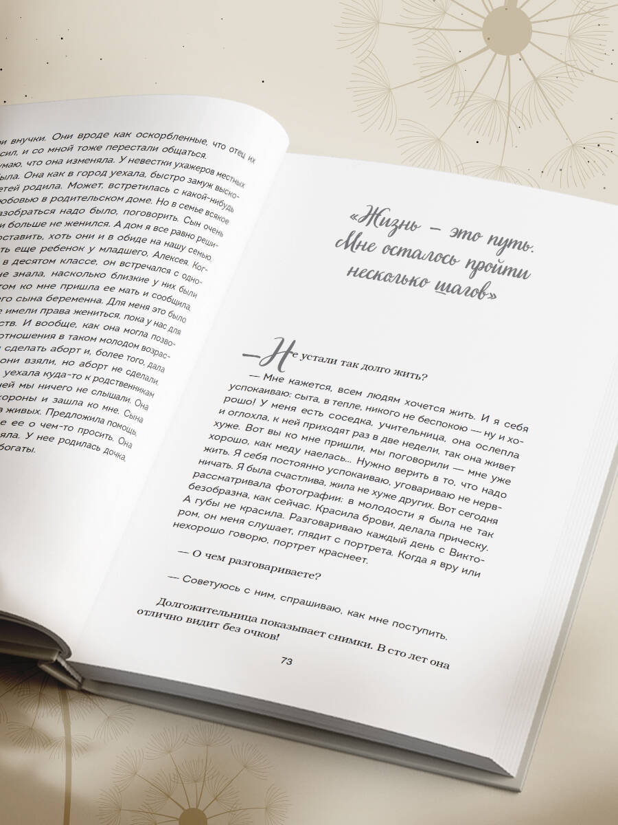 В эпоху изобилия материальных благ и поверхностных удовольствий, когда мы порой забываем о настоящих ценностях, эта книга становится настоящим откровением. В ней автор, редактор и журналист Ольга Сафонова, отправилась в уникальное путешествие по жизни десяти женщин, каждая из которых отметила столетний юбилей. Эти бабушки, ровесницы века, делятся с нами своими воспоминаниями, тревогами, радостями и мудростью, накопленной за долгие годы. «100 лет жизни» - это не руководство по здоровому образу жизни и не сборник секретов долголетия. Это честные и трогательные истории о том, как прожить жизнь, наполненную смыслом, несмотря на все трудности и испытания. Это возможность оглянуться на свой пройденный путь и понять, что у нас есть только один шанс на счастье и время летит быстрее, чем мы думаем. «Это не просто книга, а возможность перенять мудрость и опыт тех, кто прожил долгую и насыщенную жизнь. Она поможет каждому читателю переосмыслить свой собственный путь. Мысли и переживания столетних бабушек, описанные с такой искренностью и теплотой, вдохновляют и заставляют задуматься о вечных вопросах». - Вячеслав Опахин, главный редактор спортивного портала «Чемпионат» «Везде, везде роботала - и за мужика, и за бабу». «Любоф - не любоф, пришлось жить вместе». «Когда морально счастлив человек, мне кажется, уже жить можно. Вот я сейчас живу одна. А я счастлива! Почему? Потому что я никому не мешаю». «Мне всю жизнь хотелось, чтобы все было по-честному, поступала так, чтобы в первую очередь детям было хорошо, но сберечь я их не смогла». «Культура была на высоте. Собирались в клубе - ни одного пьяного, ни одного курящего. Одеты небогато, но аккуратно и чисто». «В этом мире никогда нельзя расслабляться, всегда нужно быть начеку. Даже когда тебе перевалило за 100, важно не терять бдительность». «Вы всегда во что-то верите, вы должны верить во что-то в своей жизни, по крайней мере, это дает силы и привносит в жизнь хоть какой-то смысл». «Счастье так скоротечно. Но если ты его познал, оно дает силы жить дальше и радоваться многим важным моментам». «Человек намного сильнее и может принять гораздо больше, чем мы думаем. Мы недооцениваем себя и то, что в нас есть. Мне выпало это понять: несмотря на удары судьбы, совсем необязательно вести несчастный образ жизни. Конечно, при условии, что вы ищете счастья не только в чем-то глобальном, но и в малом. При условии, что вы готовы извлечь из этого максимум пользы, несмотря ни на что». «Юмор помогал мне преодолевать препятствия снова и снова, так как любую напряженную ситуацию можно разрядить хорошей шуткой». «Есть люди, которые могут передать свое плохое настроение другим. Таких нужно избегать по возможности. А вместе с ними избегать сплетен, жалоб и людей, которые живут с постоянной тревогой на душе. Нужно идти по жизни с теми, кто делает вас счастливым. И начните улыбаться своей жизни. Я почти всегда была в хорошем настроении». «Матери дети остаются детьми в любом возрасте. Моему младшему сыну тоже уже за семьдесят, а я всё равно за него волнуюсь, как будто ему семь».| Издательство | ООО "Издательство "Эксмо" |