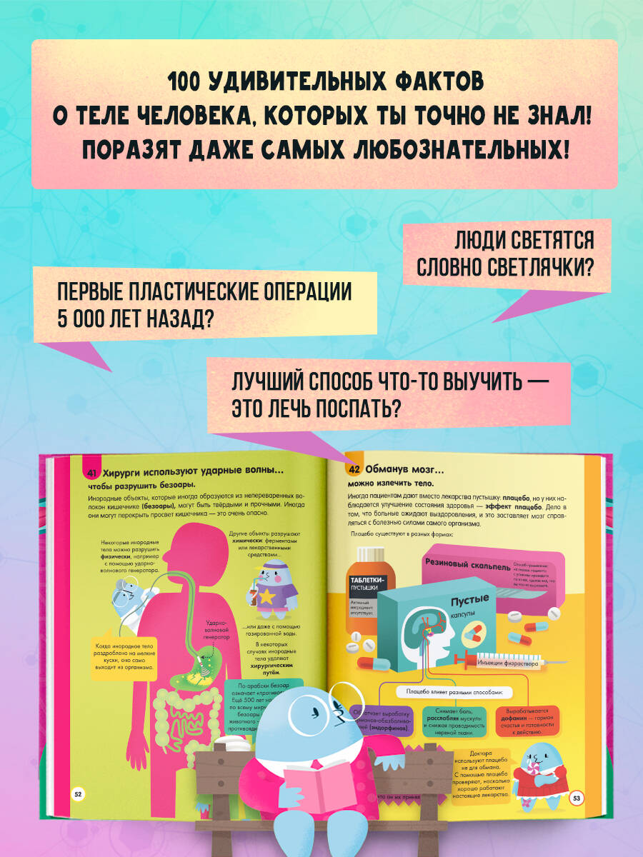 Знаешь ли ты, что первые пластические операции делали ещё 5000 лет назад? А что люди светятся словно светлячки? Или, что лучший способ что-то выучить - это лечь поспать? Эта информативная книга с красочными иллюстрациями содержит удивительные факты и полезную информацию ровно по 100 темам, касающимся человеческого тела. Ты узнаешь много нового, о чём точно не читал в учебниках, а благодаря инфографике вся сложная информация усвоится легко и быстро. Для среднего школьного возраста.| Издательство | Издательство "АСТ" |