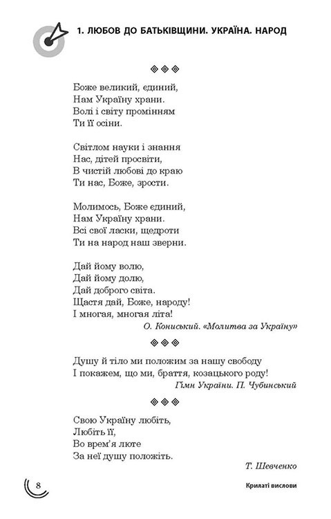 ВІДПОВІДАЄ ЧИННІЙ ПРОГРАМІ МОН УКРАЇНИ. Сучасний посібник із крилатими висловами, народними прислів'ями та приказками неодмінно знадобиться усім, хто цікавиться багатством рідної мови та літератури. Посібник складається з двох частин, у кожній із яких матеріал згруповано за тематичним принципом. У частині «Крилаті вислови» зібрано яскраві висловлювання та цитати з творів видатних особистостей про найважливіші загальнолюдські цінності. Частина «Українські народні прислів'я та приказки» містить багату колекцію влучних народних висловів на найрізноманітніші теми. Рекомендований для школярів, учителів, батьків, студентів. "100 тем" - увесь шкільний курс у 100 темах! Чому варто почитати?Матеріали посібника призначені для широкого кола читачів: учителям допоможуть у процесі розробки уроків з української мови та літератури або виховних заходів школярам і студентам стануть у пригоді при написанні творів, есе, інших видів письмових робіт старшокласникам нададуть поштовх для роздумів над текстом власного висловлювання, яке є обов'язковою частиною сертифікаційної роботи з української мови та літератури (ДПА та ЗНО).