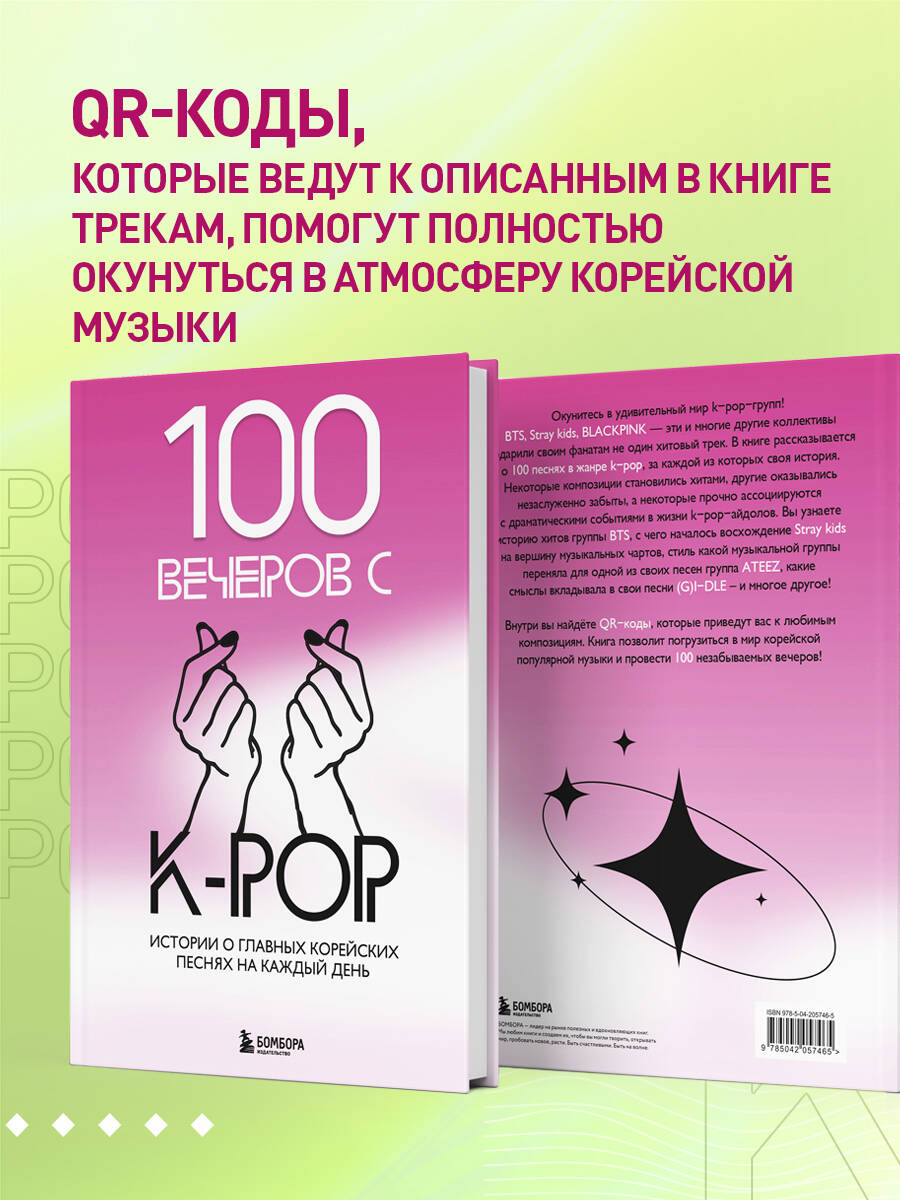 Окунитесь в удивительный и самобытный мир K-pop групп! BTS, Stray kids, BLACKPINK - эти и многие другие коллективы подарили своим фанатам не одну легендарную композицию. В книге рассказывается о 100 песнях в жанре K-pop, за каждой из которых своя история. Некоторые композиции становились хитами, другие оказывались незаслуженно забыты, а некоторые прочно ассоциируются с драматическими событиями в жизни K-pop айдолов. Вы узнаете историю хитов группы BTS, с чего началось восхождение Stray kids на вершину музыкальных чартов, стиль какой музыкальной группы переняла для одной из своих песен группа ATEEZ, какие смыслы вкладывала в свои песни (G)I-DLE - и многое другое! Внутри вы найдете QR-коды, которые приведут вас к любимым композициям. Книга позволит погрузиться в мир корейской популярной музыки и провести 100 незабываемых вечеров!
