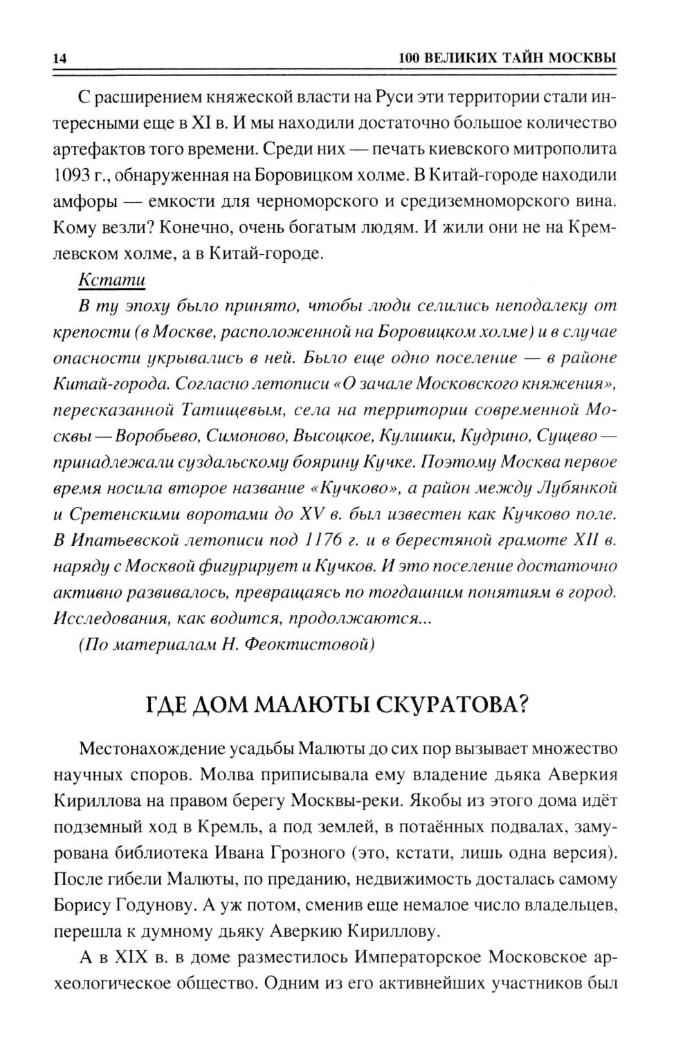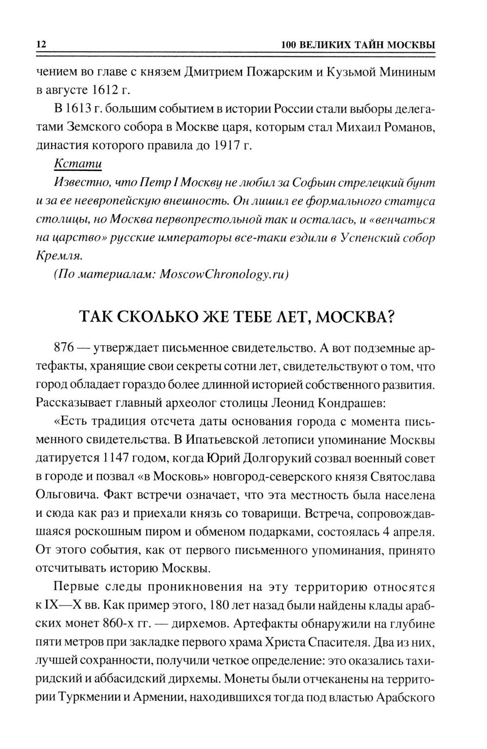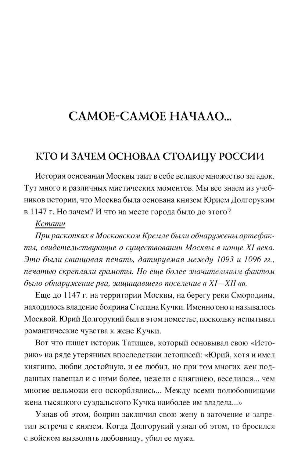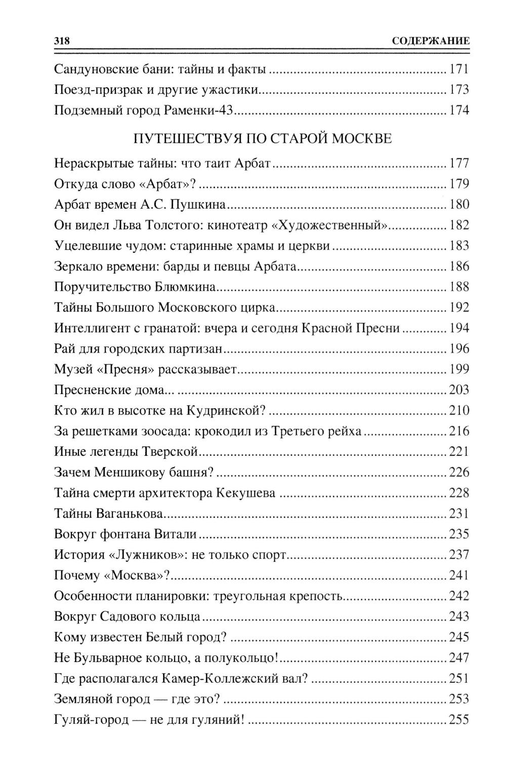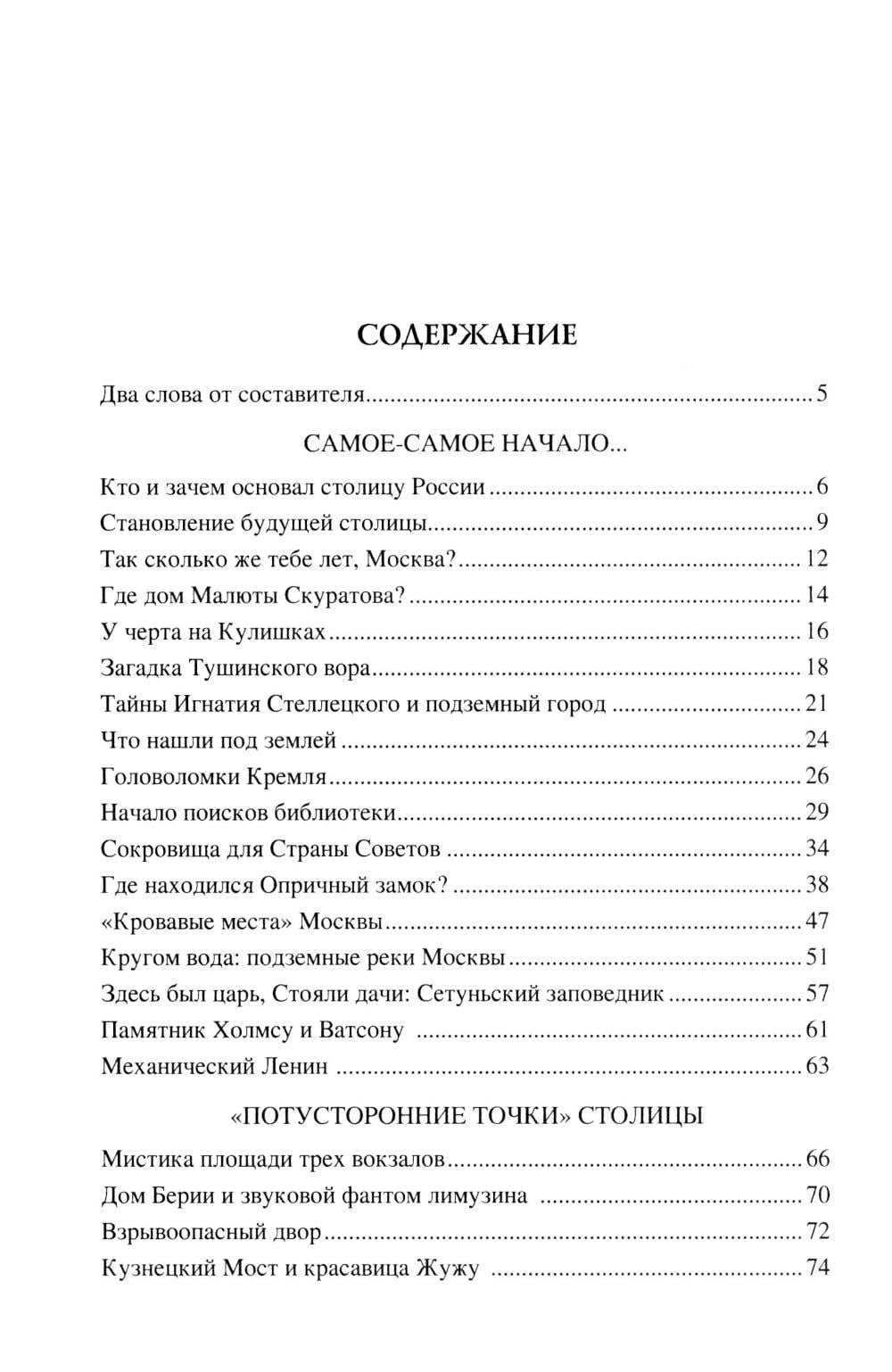 Москва знаменита своей древней историей и великими людьми некогда населявшими ее. Как и многие столицы мира ее стены и мостовые хранят множество тайн, разгадать которые вот уже не один век пытаются исследователи. Таинственные особняки, исчезнувшие улицы и переулки, многокилометровые подземные лабиринты и секретные бункеры, печальные некрополи и богатые загадочным прошлым башни, площади и проспекты. Об этом и многом другом рассказывает очередная книга серии.