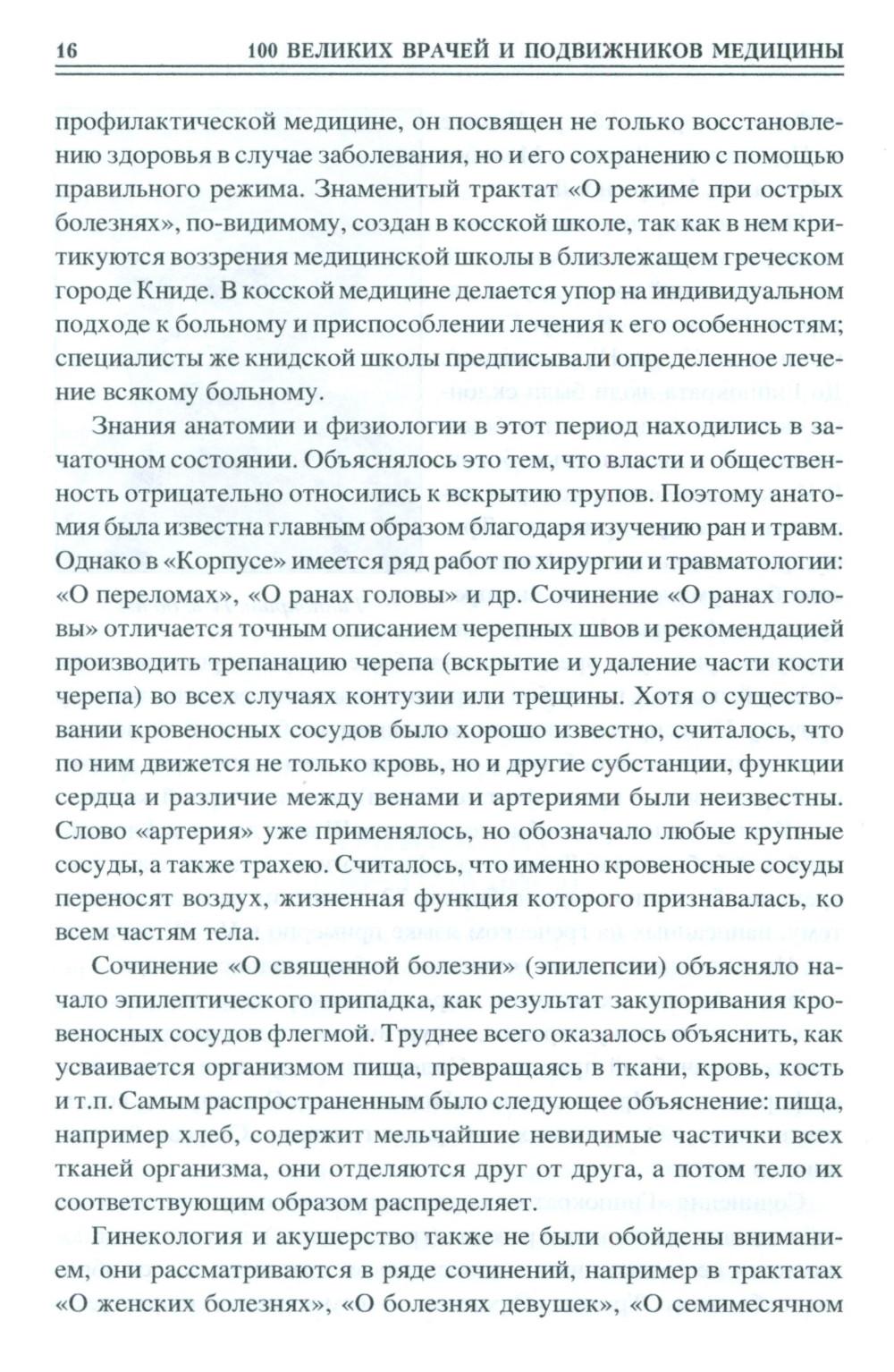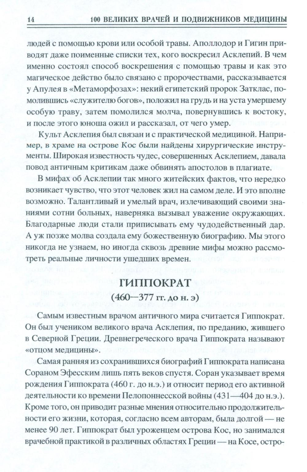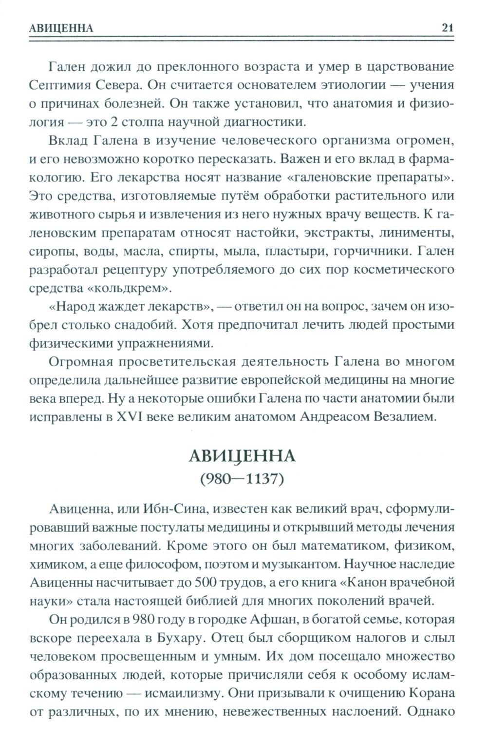 История медицины знает немало великих имен. Некоторые врачи и исследователи сделали настолько важные открытия в медицине, что их имена вошли в историю наряду с Гиппократом. Они спасали жизни и показали миру, что медицина - это не просто наука, но и искусство. В книге представлены жизнеописания выдающихся врачей и подвижников медицины прошлого и настоящего, прославившихся в различных областях медицинской науки: в хирургии, изучении человеческого организма и влияний на него окружающей среды, в разработке симптоматики болезней, проблем диагностики и профилактики, в создании сложнейших методик лечения и ныне известных каждому человеку медицинских приборов и т.д. Читатель познакомится с поистине героической, подвижнической жизнью 100 великих деятелей мировой медицины. Среди них - Асклепий и Авиценна, Парацельс и Гарвей, Ларрей и Пирогов, Пастер и Сеченов, Мечников и Павлов, Бехтерев и Илизаров...| Издательство | Вече |