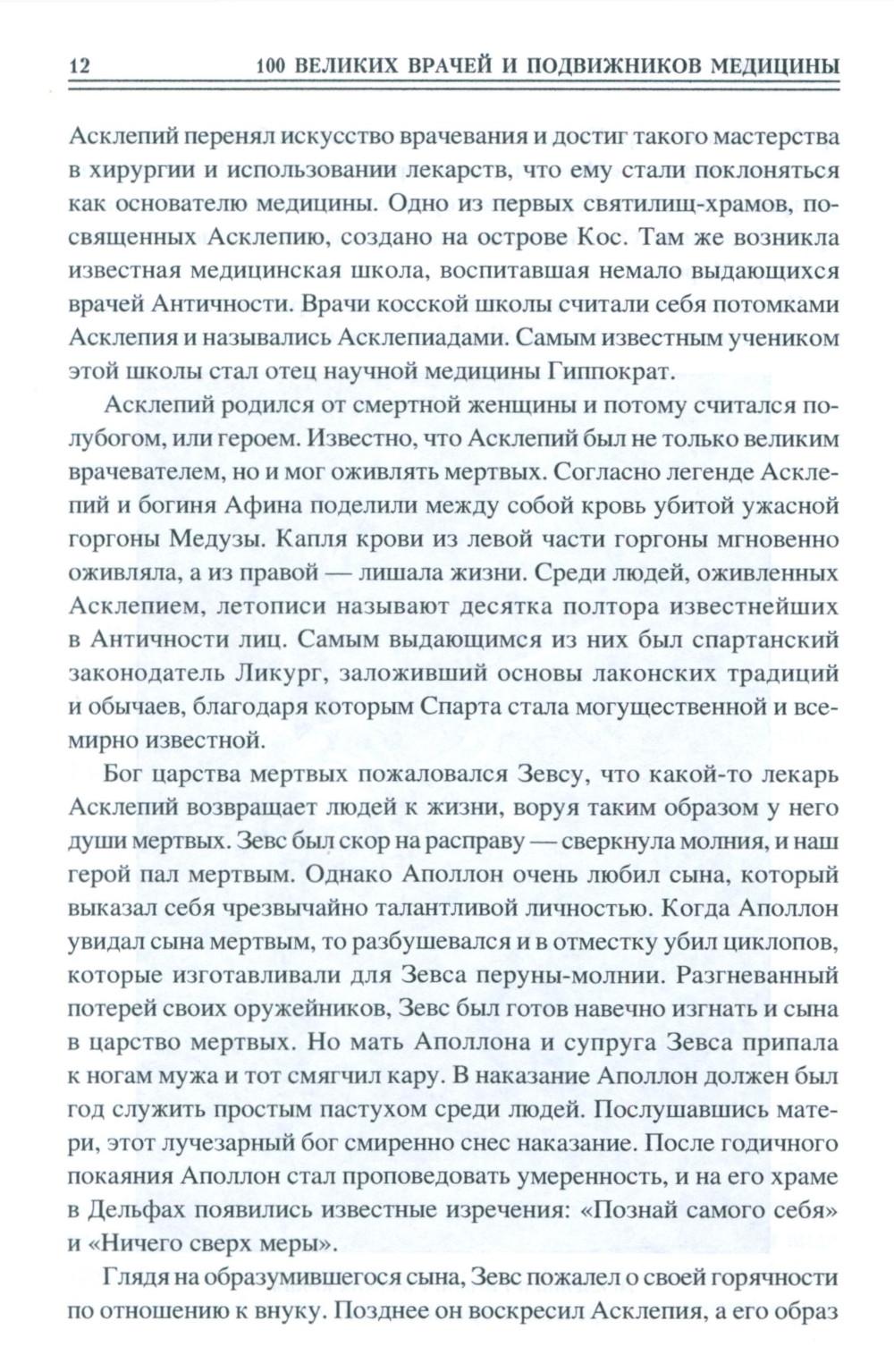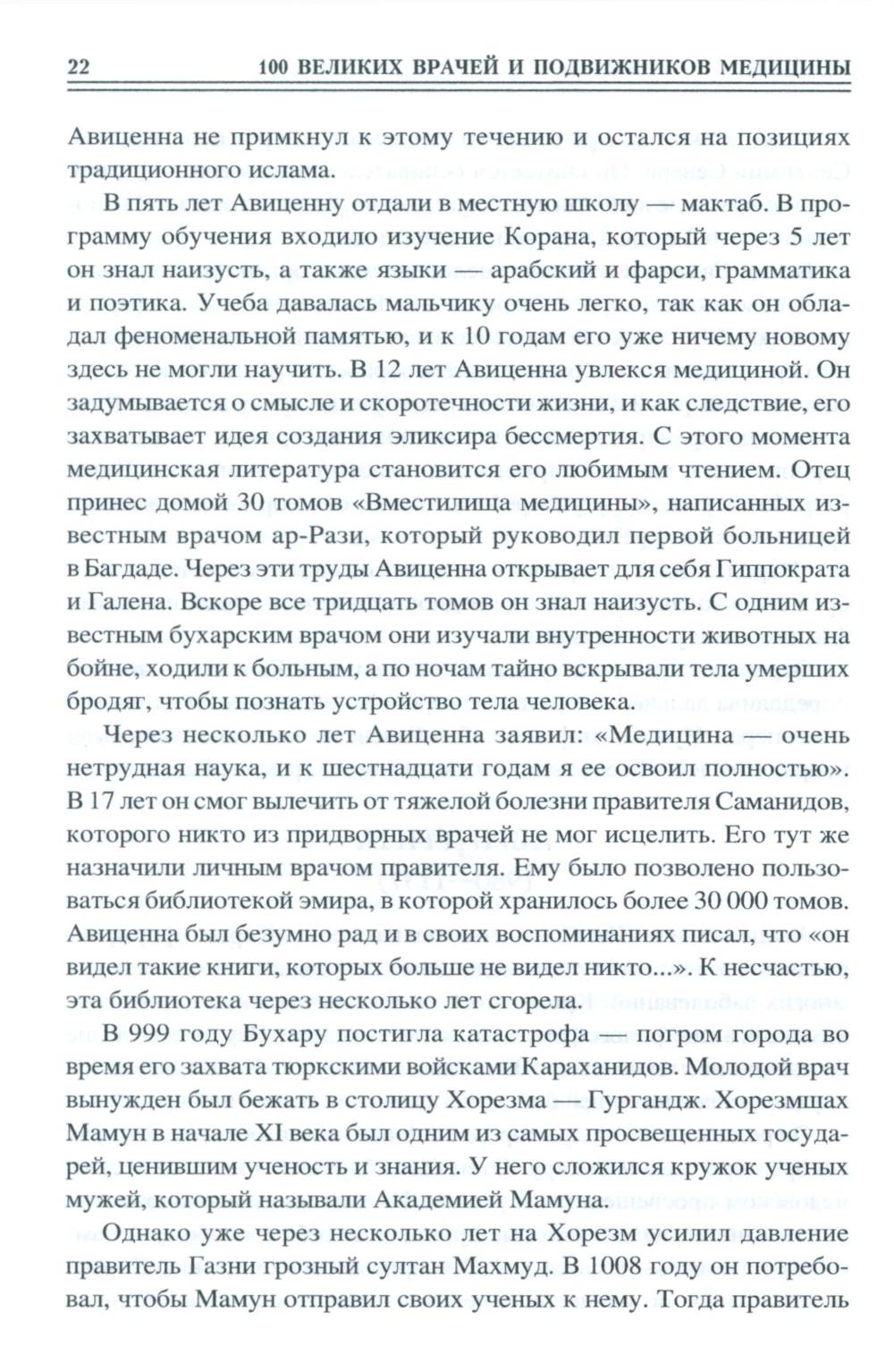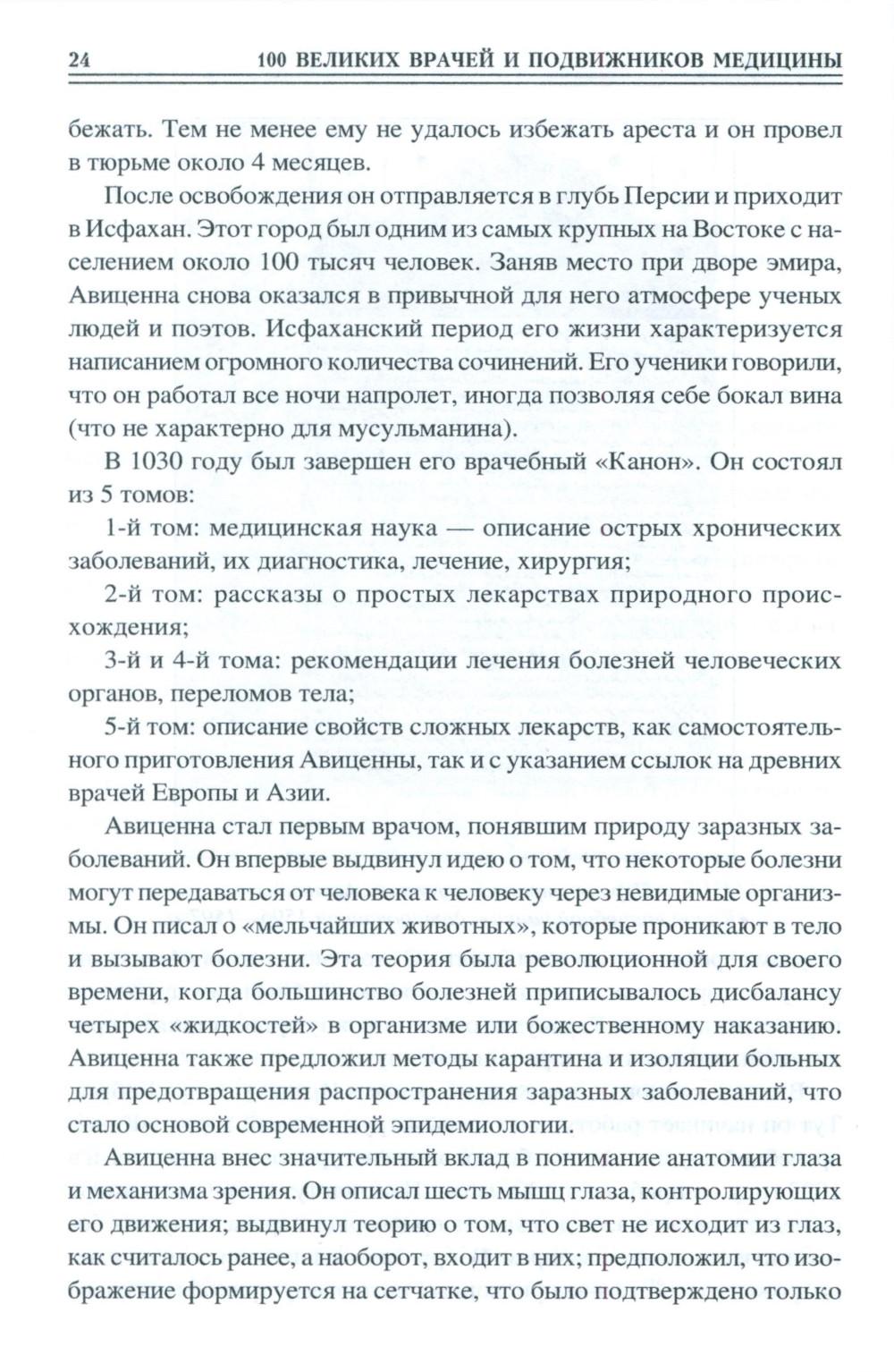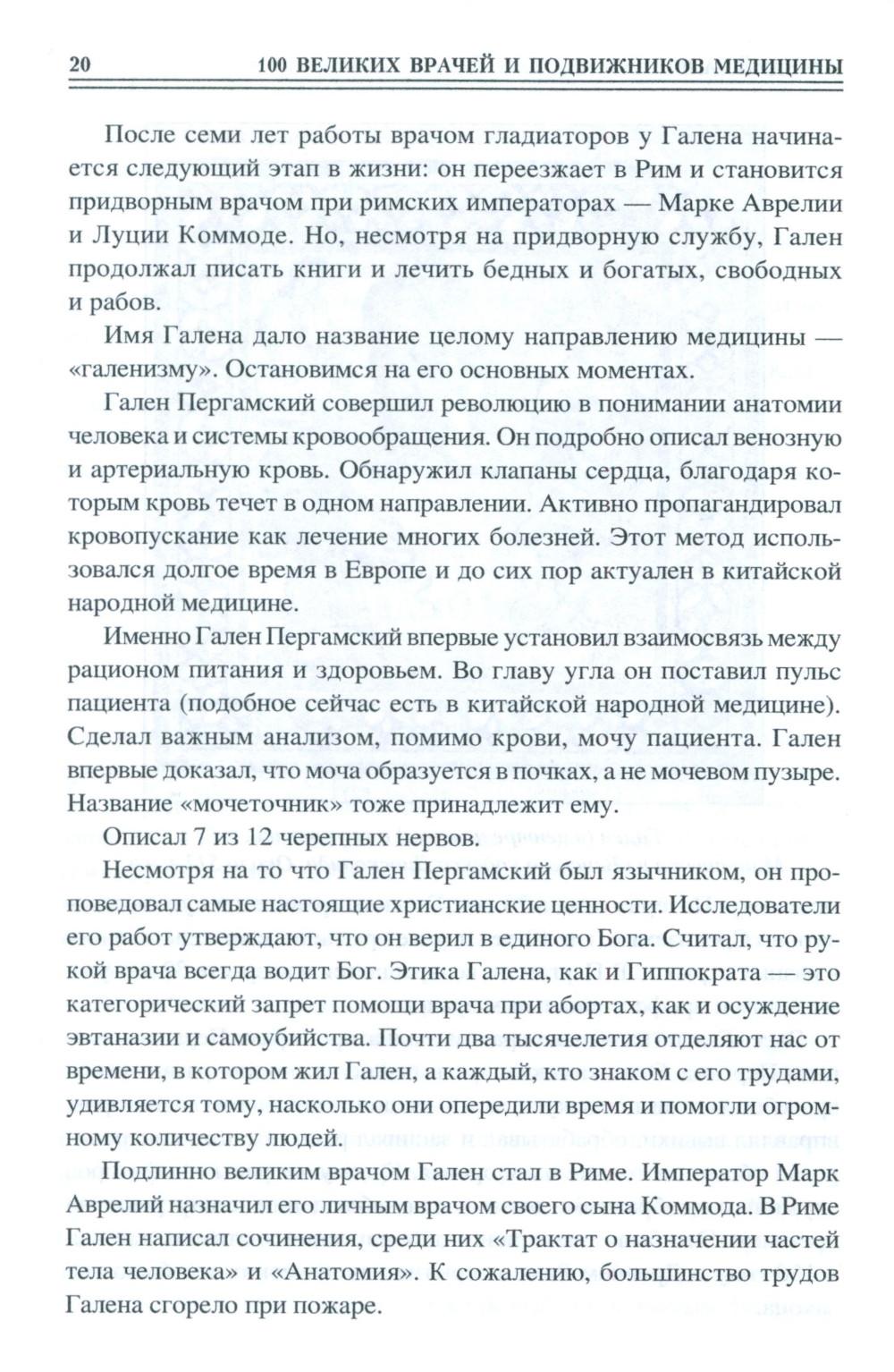 История медицины знает немало великих имен. Некоторые врачи и исследователи сделали настолько важные открытия в медицине, что их имена вошли в историю наряду с Гиппократом. Они спасали жизни и показали миру, что медицина - это не просто наука, но и искусство. В книге представлены жизнеописания выдающихся врачей и подвижников медицины прошлого и настоящего, прославившихся в различных областях медицинской науки: в хирургии, изучении человеческого организма и влияний на него окружающей среды, в разработке симптоматики болезней, проблем диагностики и профилактики, в создании сложнейших методик лечения и ныне известных каждому человеку медицинских приборов и т.д. Читатель познакомится с поистине героической, подвижнической жизнью 100 великих деятелей мировой медицины. Среди них - Асклепий и Авиценна, Парацельс и Гарвей, Ларрей и Пирогов, Пастер и Сеченов, Мечников и Павлов, Бехтерев и Илизаров...| Издательство | Вече |