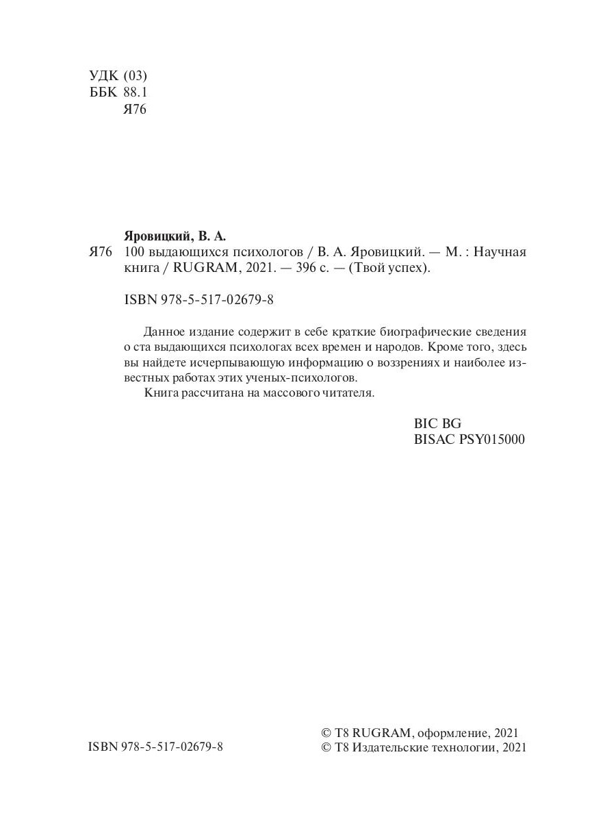 Данное издание содержит в себе краткие биографические сведения о ста выдающихся психологах всех времен и народов. Кроме того, здесь вы найдете исчерпывающую информацию о воззрениях и наиболее известных работах этих ученых-психологов.