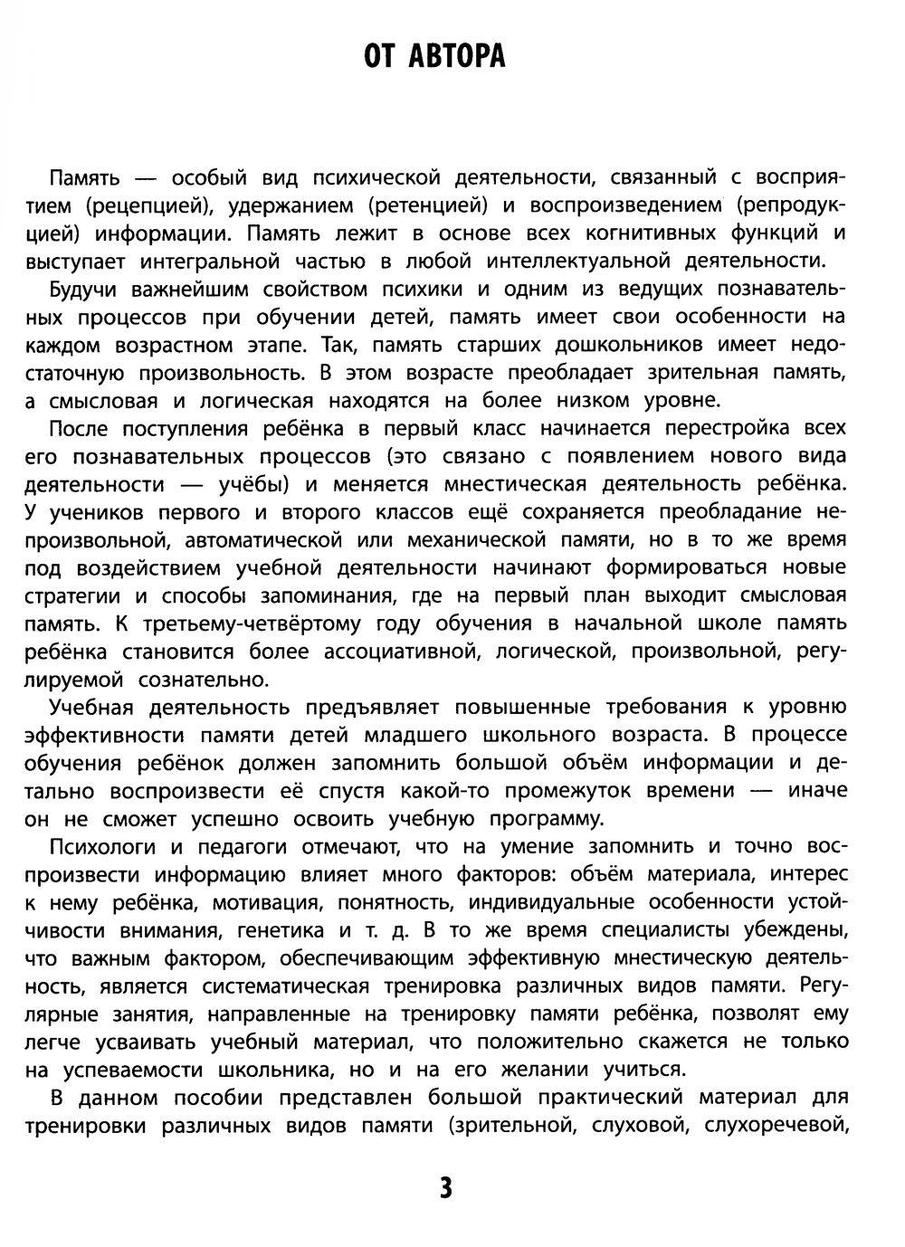 Память - это важнейшая способность мозга. Чем лучше развита память, тем успешнее ребёнок познаёт окружающий мир, осваивает новые навыки, обучается. В книге собраны 100 заданий для комплексного развития и тренировки зрительной, слуховой, слухоречевой, зрительно-моторной, двигательной памяти младших школьников.