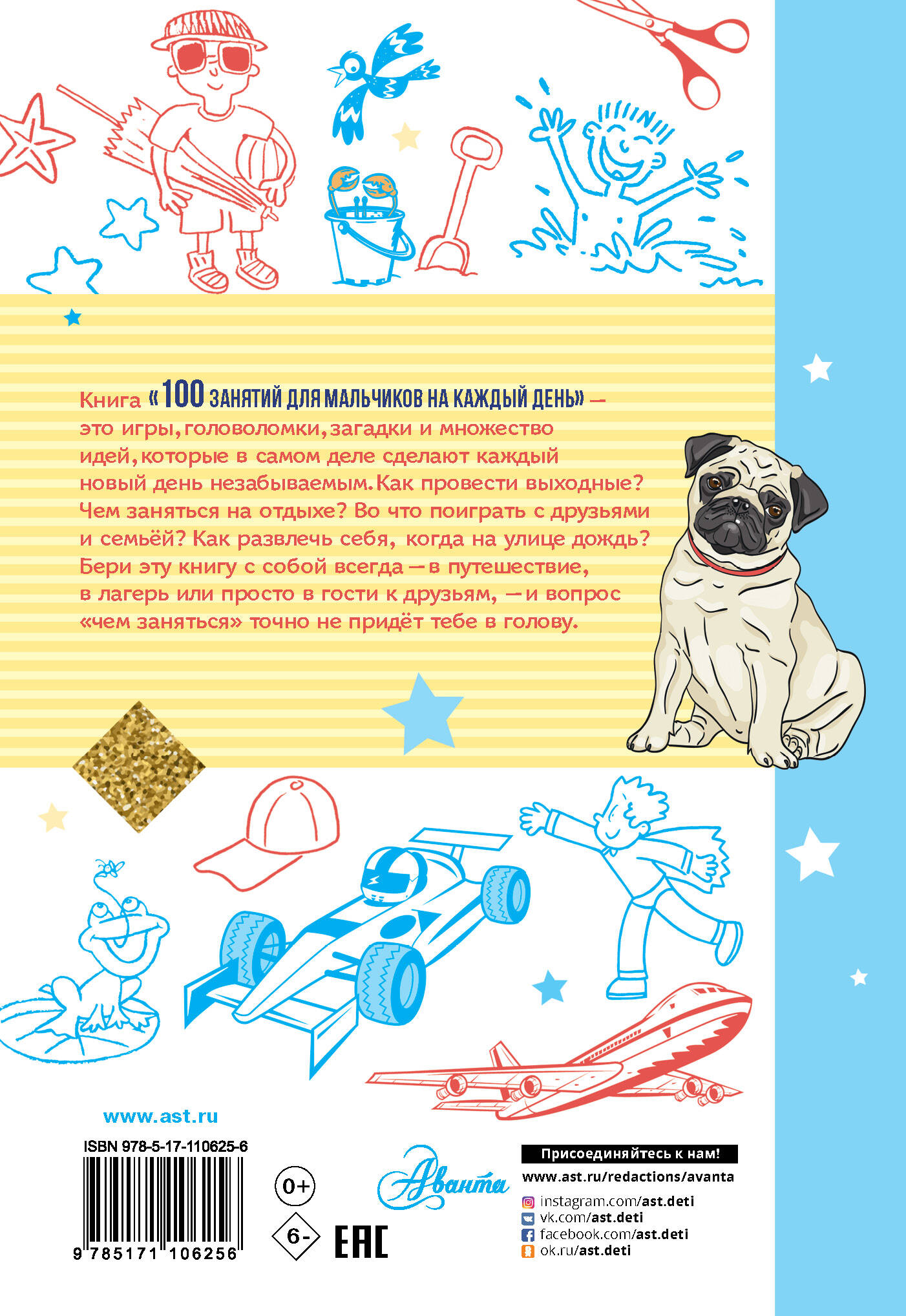 Книга «100 занятий для мальчиков на каждый день» - это игры, головоломки, загадки и множество идей, которые, в самом деле, сделают каждый новый день незабываемым. Как провести выходные? Чем заняться на отдыхе? Во что поиграть с друзьями и семьёй? Как развлечь себя, когда на улице дождь? Бери эту книгу с собой всегда - в путешествие, в лагерь или просто в гости к друзьям, - и вопрос «чем заняться» точно не придёт тебе в голову.| Издательство | ИЗДАТЕЛЬСТВО "АСТ" |