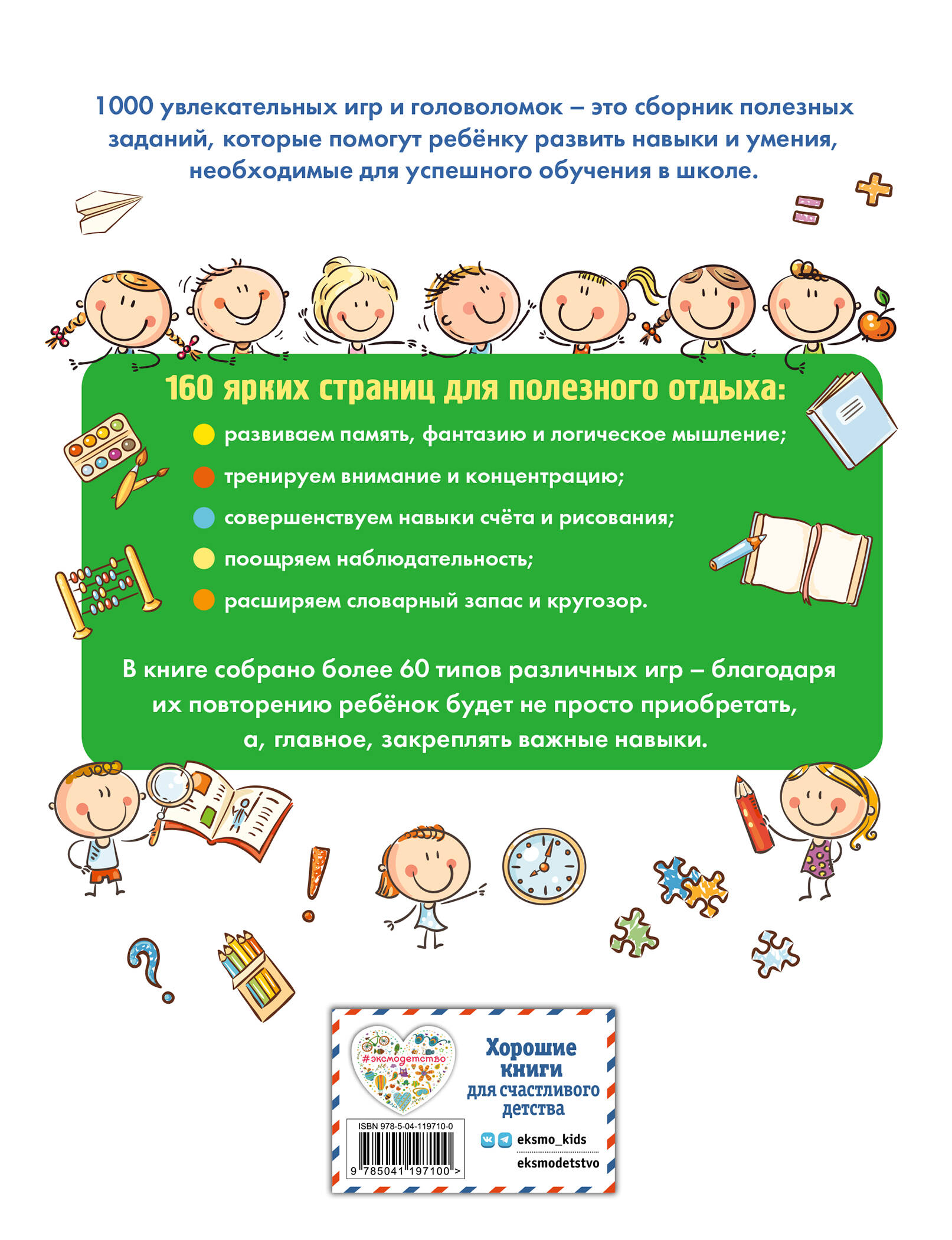Бросьте вызов ребенку - подарите ему целую 1000 заданий, среди которых более 60 видов различных упражнений: лабиринты, поиск отличий, игры с буквами, несложные задания на счет, поиск силуэтов, сетки с буквами, игры с трафаретами, рисование по точкам и клеточкам, раскраски, рисовалки, игры в ассоциации и даже познавательные вопросы. С играми, подобранными для этого сборника: - мы развиваем различные стратегии мышления у детей; - поощряем наблюдательность, навыки сравнения и поиска отличий; - развиваем внимание, пространственное и ассоциативное мышление; - тренируем концентрацию, не принуждая ребенка выполнять скучные, монотонные задания. Решение таких головоломок повышает уверенность ребенка в собственных силах и побуждает его выходить за рамки привычных игр, исследовать новое. «1000 увлекательных заданий» станут отличным развлечением, в процессе которого ребенок будет развивать ряд важных навыков и умений.