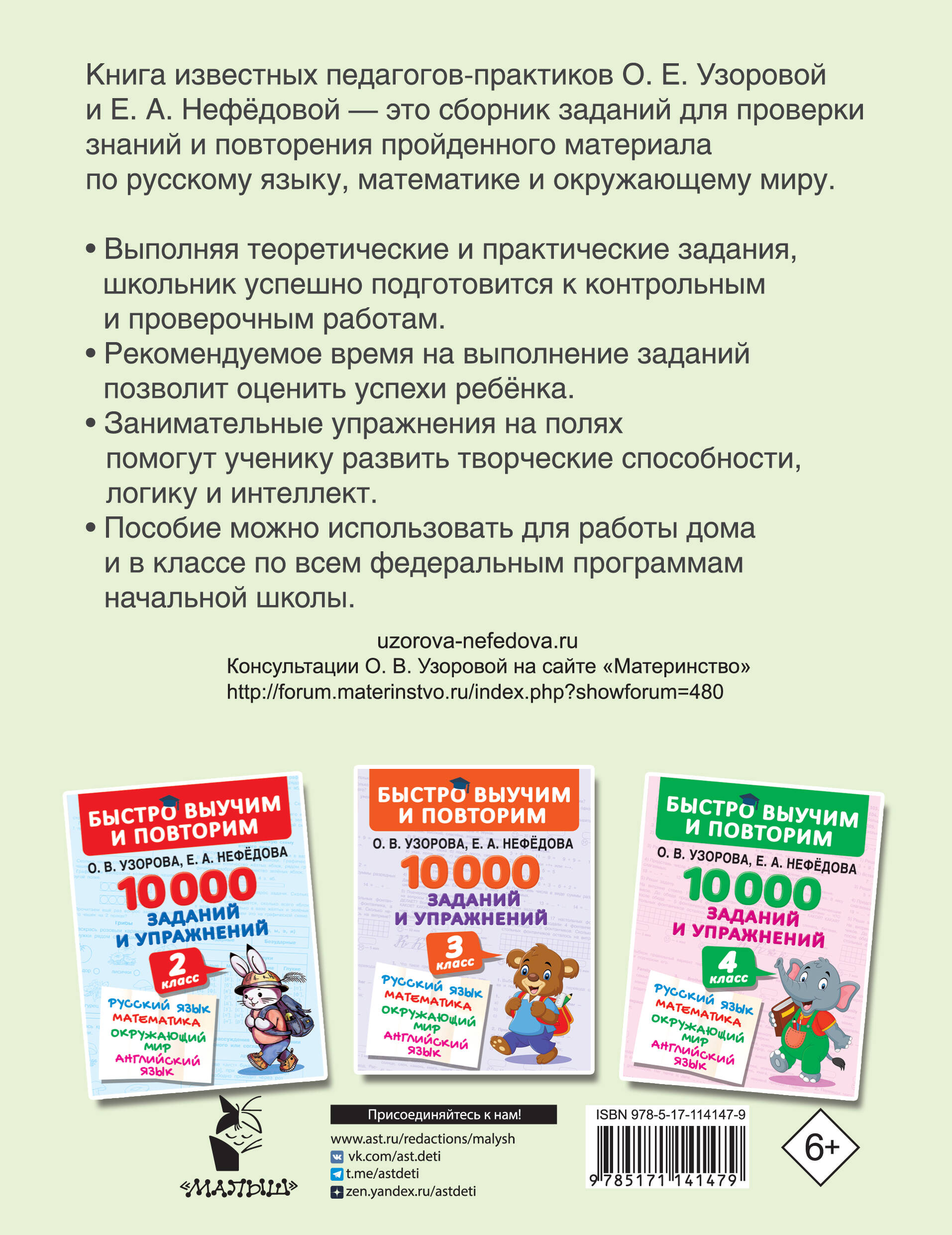 Книга известных педагогов-практиков О. Е. Узоровой и Е. А. Нефёдовой «10000 заданий и упражнений. 1 класс. Русский язык, Математика, Окружающий мир» - это сборник заданий для проверки знаний и повторения пройденного материала по предметам «Русский язык», «Математика» и «Окружающий мир». Выполняя задания и решая примеры, ученик закрепит знания, полученные в процессе обучения. Занимательные упражнения на полях книги помогут школьнику потренировать интеллект и логику, развить творческие способности. Особенности книги: • Задания по предметам «Русский язык», «Математика» и «Окружающий мир» в одной книге. • Упражнения на полях помогут ребёнку потренировать интеллект и логику, развить творческие способности. • Рекомендуемое время на выполнение заданий позволит узнать, какие упражнения даются ученику легко, а какие вызывают затруднение. • Пособие можно использовать для работы дома и в классе по всем федеральным программам.| Издательство | ИЗДАТЕЛЬСТВО "АСТ" |