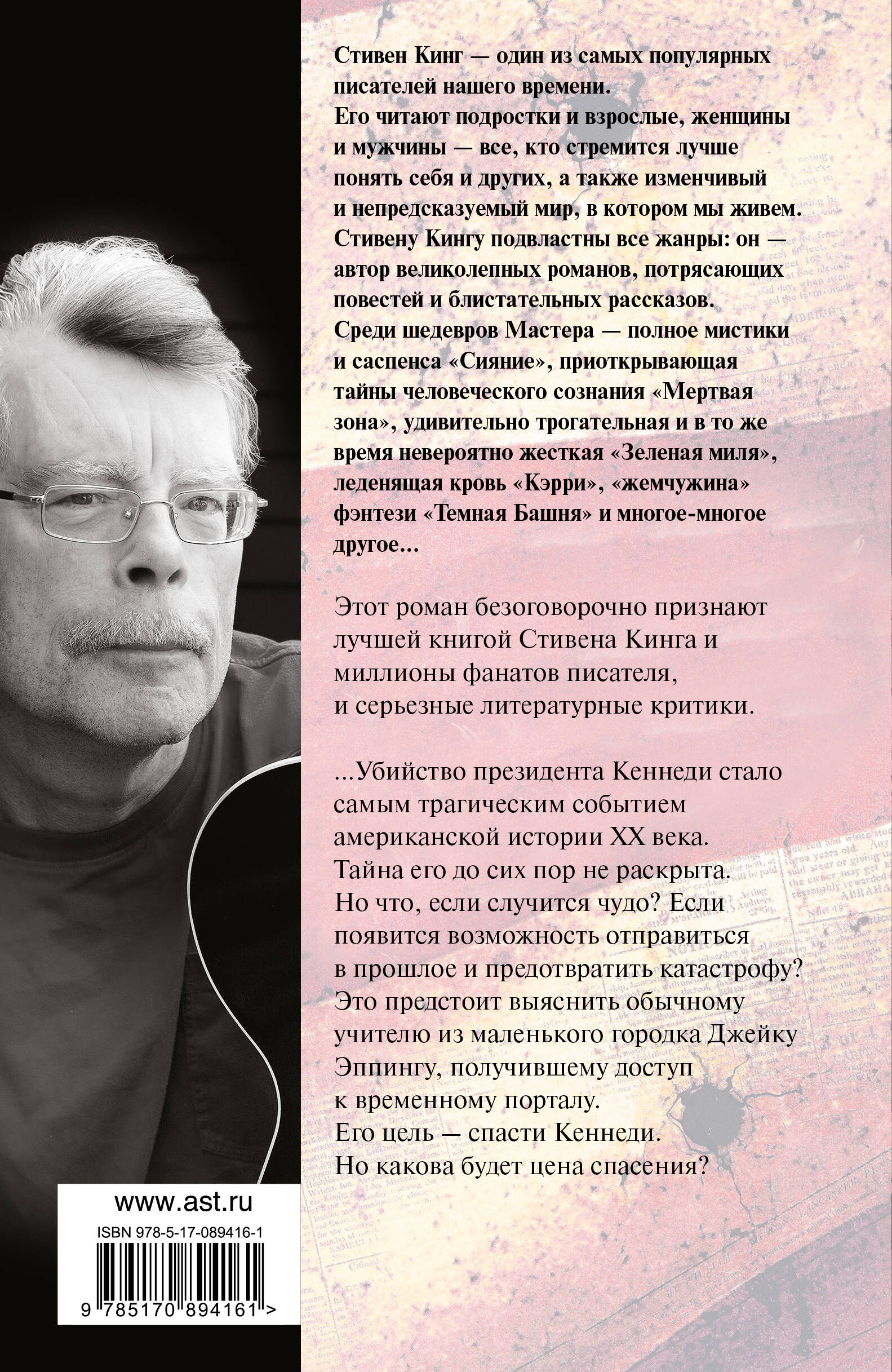 ...Убийство президента Кеннеди стало самым трагическим событием американской истории ХХ века. Тайна его до сих пор не раскрыта. Но что, если случится чудо? Если появится возможность отправиться в прошлое и предотвратить катастрофу? Это предстоит выяснить обычному учителю из маленького городка Джейку Эппингу, получившему доступ к временному порталу. Его цель - спасти Кеннеди. Но какова будет цена спасения?| Издательство | ИЗДАТЕЛЬСТВО "АСТ" |