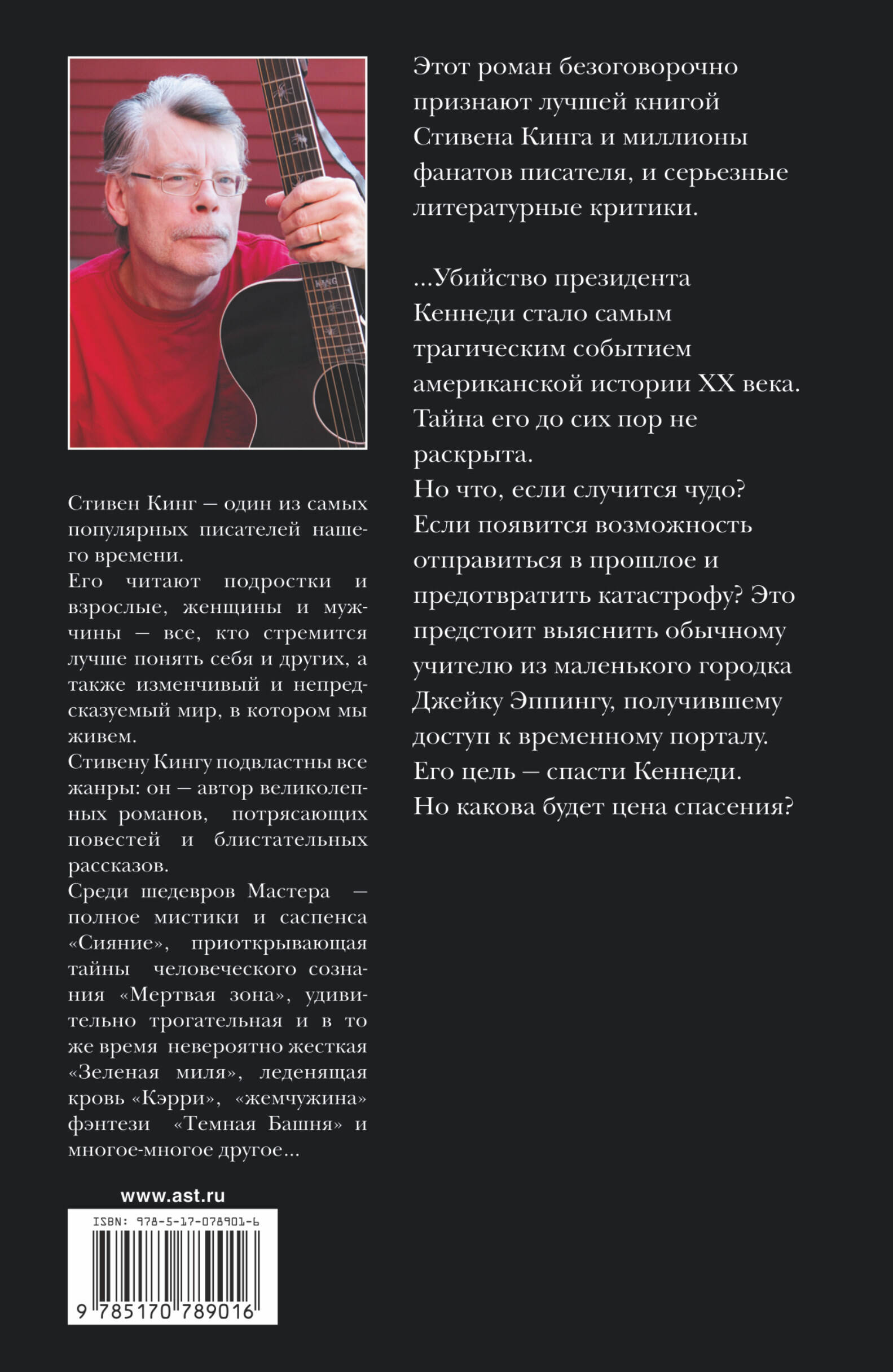 Этот роман безоговорочно признают лучшей книгой Стивена Кинга и миллионы фанатов писателя, и серьезные литературные критики. …Убийство президента Кеннеди стало самым трагическим событием американской истории ХХ века. Тайна его до сих пор не раскрыта. Но что, если случится чудо? Если появится возможность отправиться в прошлое и предотвратить катастрофу? Это предстоит выяснить обычному учителю из маленького городка Джейку Эппингу, получившему доступ к временному порталу. Его цель - спасти Кеннеди. Но какова будет цена спасения?| Издательство | АСТ |