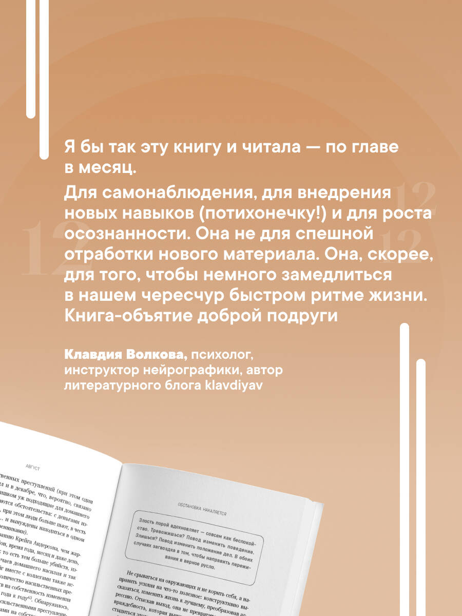 КНИГА-ПЛАН НА КАЖДЫЙ МЕСЯЦ, КОТОРАЯ СДЕЛАЕТ ВАШУ ЖИЗНЬ ЛУЧШЕ! Люси Маддокс, практикующий психолог, создала рабочую книгу-план заботы о себе на целый год. В каждом месяце вы найдете простые и понятные шаги, которые помогут справляться с типичными жизненными трудностями, поддерживать себя и сохранять баланс в любое время. Внутри - четкий план и упражнения, которые научат: находить силы в зимние месяцы и справляться с упадком; возвращать ясность и легкость весной; держать баланс осенью, когда дел становится слишком много; завершать год без стресса и перегрузки.| Издательство | ООО "Издательство "Эксмо" |