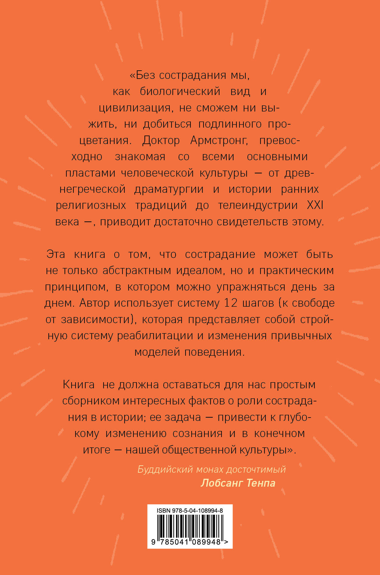 «Опираясь на мудрость разных религий и философий, доктор Армстронг представляет универсальную систему для развития сострадания, которую может применить каждый». - Washington Post Автор книги - одна из самый оригинальных мыслителей современности, ее книги переведены на более чем сорок языков мира. Она превосходно знакома с всеми основными пластами человеческой культуры - от древнегреческой драматургии и истории ранних религиозных традиций до телеиндустрии XXI века. Эта книга о том, что сострадание может быть не только абстрактным идеалом, но и практическим принципом, в котором можно упражняться день за днем. Доктор Армстронг использует в качестве шаблона известную общемировую Систему двенадцати шагов (к свободе от зависимости). Эти шаги представляют собой стройную систему реабилитации и изменения привычных моделей поведения. Такое же прикладное назначение имеют и шаги к подлинному состраданию, перечисленные в данной книге.| Издательство | ООО "Издательство "Эксмо" |