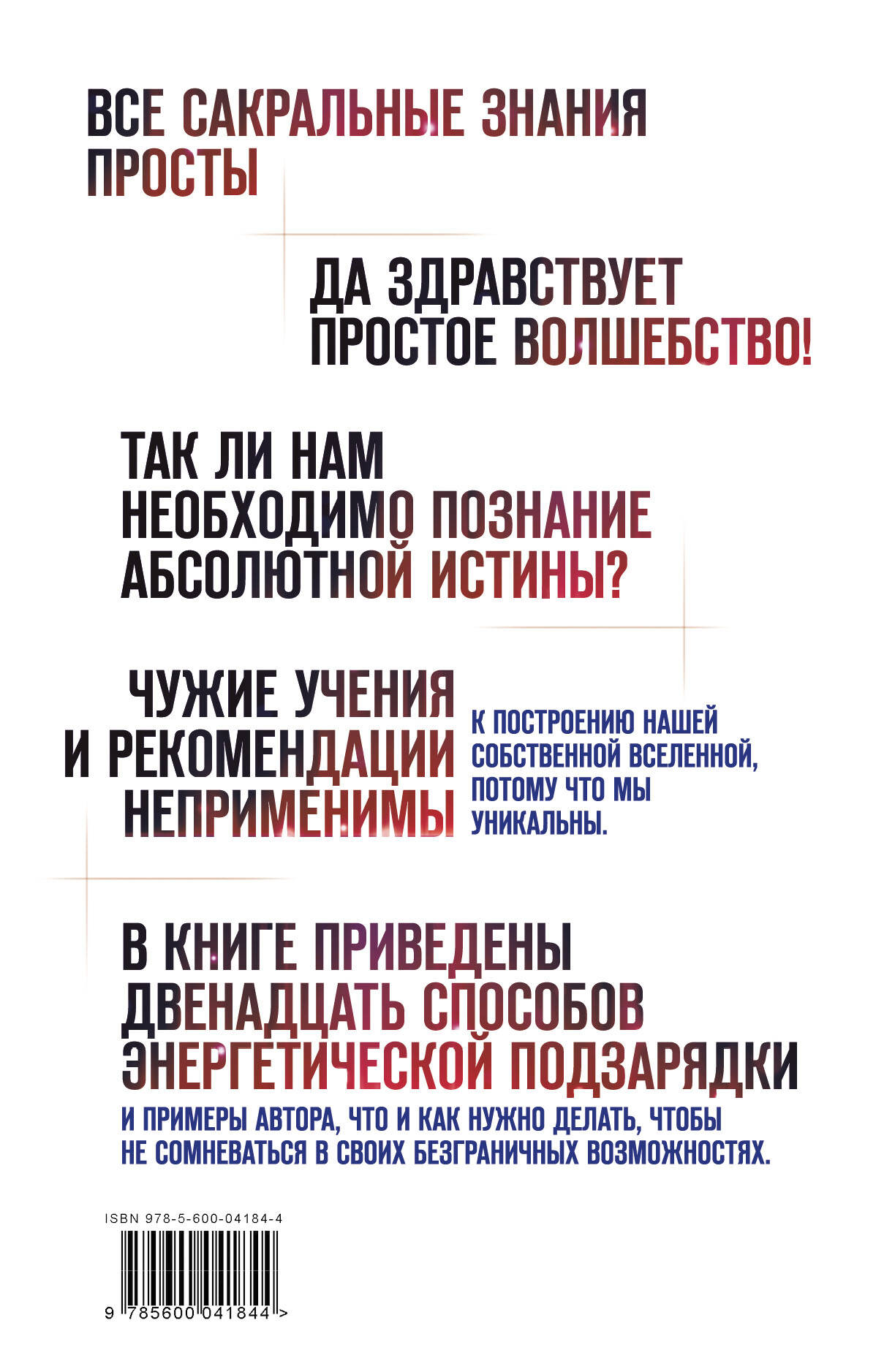ОБ АВТОРЕ: Кира Дан - ученый в области космической прикладной инженерии (rocket science). С годами данных фундаментальной науки ей становилось недостаточно, и потребовались знания эзотерики и философии в широком смысле. Кира Дан начала обращать свои размышления о Вселенной в слова, создавая тексты, полные загадок и философских размышлений. Это её первая - дерзкая и ломающая стереотипы - книга о тайнах энергетического существования человека на Земле и создания своей собственной Вселенной. Ее убеждение заключается в том, что каждый индивидуум на планете должен отыскать именно свой путь. Она считает, что осознание своего призвания и поиск смысла собственного воплощения являются ключом к коллективной эволюции человечества. Ее миссия - очень просто рассказать о сложном и загадочном. Книга убеждает читателя, что всем пора осознать, что не существует учителя, гуру, наставника, который укажет нам путь к ресурсному состоянию и смысл жизни. Чужие учения и рекомендации неприменимы к построению нашей собственной Вселенной, потому что мы уникальны. В книге приведены двенадцать способов энергетической подзарядки и примеры автора, что и как нужно делать, чтобы не сомневаться в своих безграничных возможностях. ЦИТАТЫ: «Времени нет. Будущего не существует». «Все сакральные знания просты». «Да здравствует простое Волшебство!» «Так ли нам необходимо познание абсолютной истины?» «Кроме нас самих нет других Великих Архитекторов нашей жизни».| Издательство | ООО "Издательство "Эксмо" |