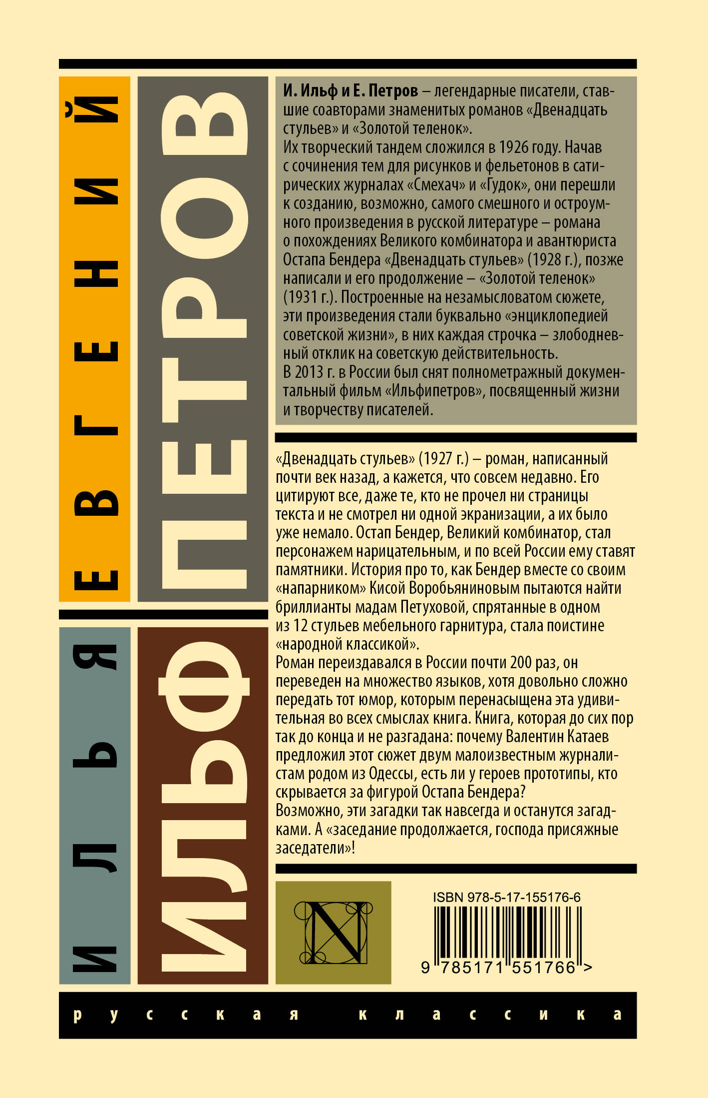 "Двенадцать стульев" (1927 г.) - роман, написанный почти век назад, а кажется, что совсем недавно. Его цитируют все, даже те, кто не прочел ни страницы текста и не смотрел ни одной экранизации, а их было уже немало. Остап Бендер, Великий комбинатор, стал персонажем нарицательным, и по всей России ему ставят памятники. История про то, как Бендер вместе со своим "напарником" Кисой Воробьяниновым пытаются найти бриллианты мадам Петуховой, спрятанные в одном из 12 стульев мебельного гарнитура, стала поистине "народной классикой". Роман переиздавался в России почти 200 раз, он переведен на множество языков, хотя довольно сложно передать тот юмор, которым перенасыщена эта удивительная во всех смыслах книга. Книга, которая до сих пор так до конца и не разгадана: почему Валентин Катаев предложил этот сюжет двум малоизвестным журналистам родом из Одессы, есть ли у героев прототипы, кто скрывается за фигурой Остапа Бендера? Возможно, эти загадки так навсегда и останутся загадками. А "заседание продолжается, господа присяжные заседатели"!| Издательство | ИЗДАТЕЛЬСТВО "АСТ" |