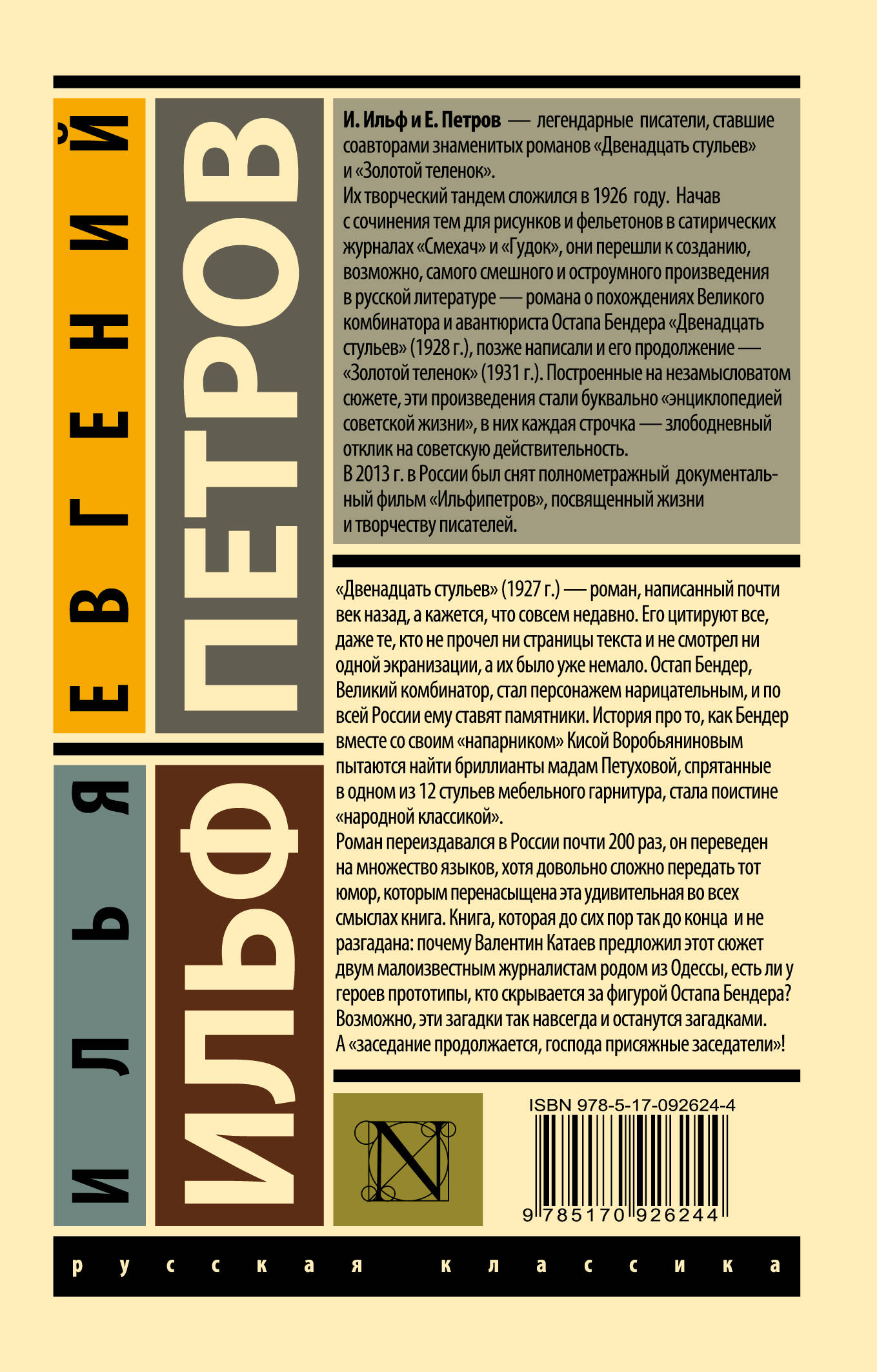 "Двенадцать стульев" (1927 г.) - роман, написанный почти век назад, а кажется, что совсем недавно. Его цитируют все, даже те, кто не прочел ни страницы текста и не смотрел ни одной экранизации, а их было уже немало. Остап Бендер, Великий комбинатор, стал персонажем нарицательным, и по всей России ему ставят памятники. История про то, как Бендер вместе со своим "напарником" Кисой Воробьяниновым пытаются найти бриллианты мадам Петуховой, спрятанные в одном из 12 стульев мебельного гарнитура, стала поистине "народной классикой". Роман переиздавался в России почти 200 раз, он переведен на множество языков, хотя довольно сложно передать тот юмор, которым перенасыщена эта удивительная во всех смыслах книга. Книга, которая до сих пор так до конца и не разгадана: почему Валентин Катаев предложил этот сюжет двум малоизвестным журналистам родом из Одессы, есть ли у героев прототипы, кто скрывается за фигурой Остапа Бендера? Возможно, эти загадки так навсегда и останутся загадками. А "заседание продолжается, господа присяжные заседатели"!| Издательство | ИЗДАТЕЛЬСТВО "АСТ" |