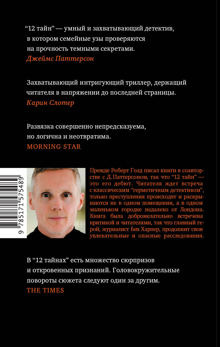 Роберта Голда нельзя назвать начинающим писателем, но прежде у него всегда был соавтор, так что "12 тайн" - это его дебют. "Герметичный детектив" всегда увлекателен, но здесь автор расширяет замкнутое пространство, где происходят преступления и их расследования, до размеров маленького городка. Жители вымышленного Хадли, расположенного неподалеку от Лондона, хорошо знают друг друга, и потому даже спустя двадцать лет после зверского убийства двух подростков это преступление живо в памяти горожан. Бен Харпер, журналист-расследователь и брат одной из жертв, самостоятельно пытается разобраться в мотивах трагедии, и ему открываются тайны его соседей и приятелей. Некоторые из этих тайн настолько жуткие, что поневоле соглашаешься со словами одного из героев книги: "Взгляд в прошлое не сулит ничего хорошего".| Издательство | Издательство "АСТ" |