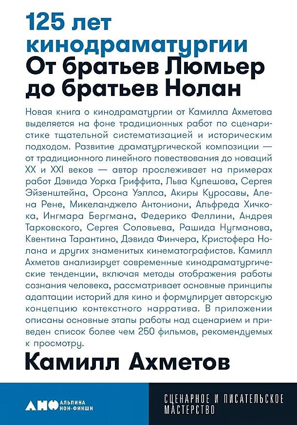 О чём книга 125 лет кинодраматургии: От братьев Люмьер до братьев Нолан Новая книга о кинодраматургии от Камилла Ахметова выделяется на фоне традиционных работ по сценаристике тщательной систематизацией и историческим подходом. Развитие драматургической композиции - от традиционного линейного повествования до новаций XX и XXI веков - автор прослеживает на примерах работ Дэвида Уорка Гриффита, Льва Кулешова, Сергея Эйзенштейна, Орсона Уэллса, Акиры Куросавы, Алена Рене, Микеланджело Антониони, Альфреда Хичкока, Ингмара Бергмана, Федерико Феллини, Андрея Тарковского, Сергея Соловьева, Рашида Нугманова, Квентина Тарантино, Дэвида Финчера, Кристофера Нолана и других знаменитых кинематографистов. "Аристотель, конечно, выделял "сплетенные" фабулы, но вряд ли он ожидал, что драматурги будущего станут запутывать и обманывать своих зрителей. Драматурги, пожалуй, тоже от себя такого не ожидали..." Камилл Ахметов анализирует современные кинодраматургические тенденции, включая методы отображения работы сознания человека, рассматривает основные принципы адаптации историй для кино и формулирует авторскую концепцию контекстного нарратива. В приложении описаны основные этапы работы над сценарием и приведен список более чем 250 фильмов, рекомендуемых к просмотру. "Никакой способ ухода от линейности не появился бы, если бы он не отражал тот или иной вид человеческого опыта. Ни один вид искусства не имеет таких возможностей осмысления действительности, как кинематограф, и развитая повествовательность - неотъемлемая часть этих возможностей". Для кого Книга будет интересна и полезна кинематографистам, киносценаристам, студентам киношкол и тем, кто хочет лучше разбираться в кино и кинодраматургии. "Как рассказать насыщенную самодостаточную историю, основанную на известных фактах или существующих произведениях? Пожертвовать богатством сюжета ради экспозиции? Ничего не сокращать и добавить экспозицию, каким бы длинным ни получился фильм? Все это возможно. Но есть и третий вариант".