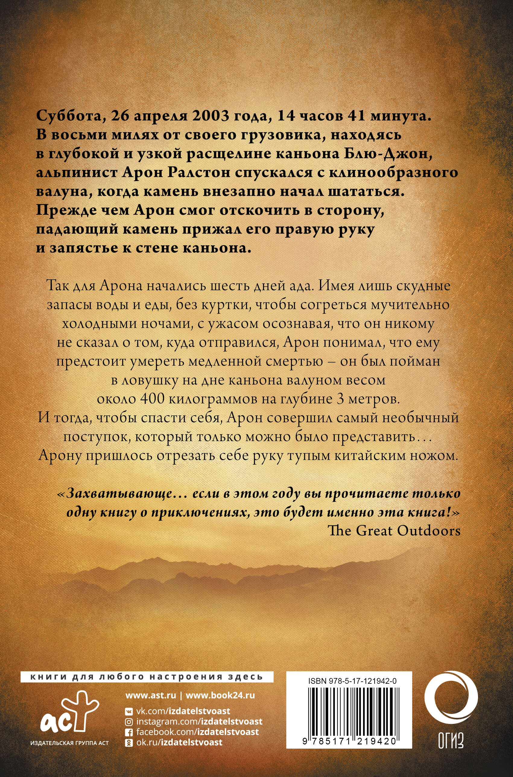 Бестселлер New York Times, послуживший основой для фильма "127 часов" Дэнни Бойла Суббота, 26 апреля 2003 года, 14 часов 41 минута. В восьми милях от своего грузовика, находясь в глубокой и узкой расщелине каньона Блю-Джон, альпинист Арон Ралстон спускался с клинообразного валуна, когда камень внезапно начал шататься. Прежде чем Арон смог отскочить в сторону, падающий камень прижал его правую руку и запястье к стене каньона. Так для Арона начались шесть дней ада. Имея лишь скудные запасы воды и еды, без куртки, чтобы согреться мучительно холодными ночами, с ужасом осознавая, что он никому не сказал о том, куда отправился, Арон понимал, что ему предстоит умереть медленной смертью - он был пойман в ловушку на дне каньона валуном весом около 400 килограммов на глубине 3 метров. И тогда, чтобы спасти себя, Арон совершил самый необычный поступок, который только можно было представить…