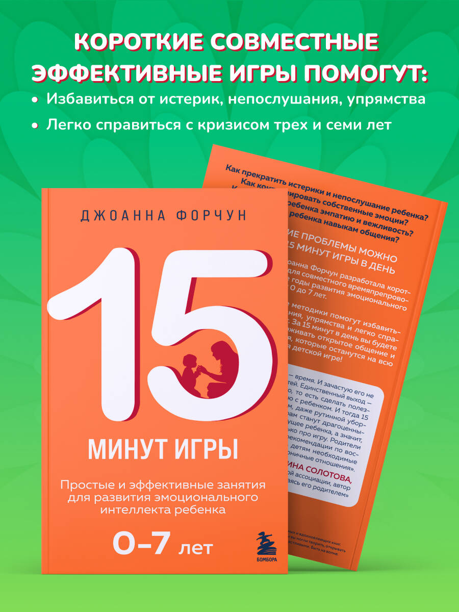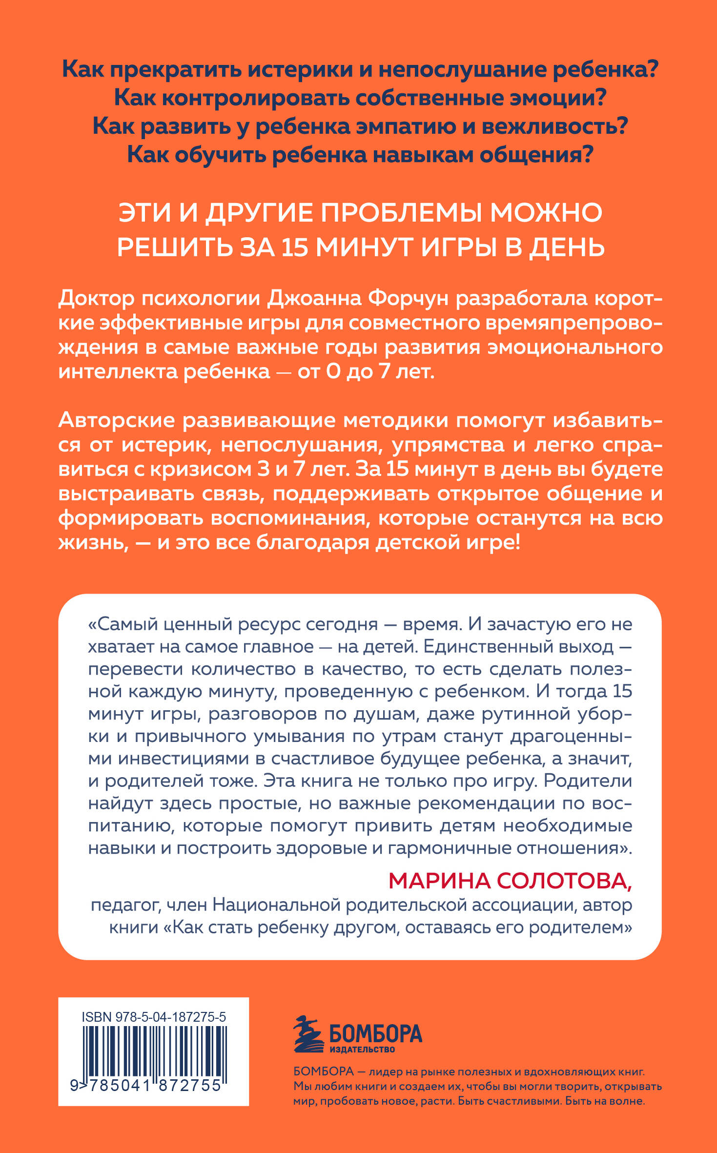 «Свое присутствие - лучшее, что вы можете подарить ребенку». Как прекратить истерики и непослушание ребенка? Как контролировать собственные эмоции? Как развить у ребенка эмпатию и вежливость? Как обучить ребенка навыкам общения? ЭТИ И ДРУГИЕ ПРОБЛЕМЫ МОЖНО РЕШИТЬ ЗА 15 МИНУТ ИГРЫ В ДЕНЬ Доктор психологии и эксперт по воспитанию Джоанна Форчун разработала короткие эффективные игры для совместного времяпрепровождения в самые важные годы развития эмоционального интеллекта ребенка, от 0 до 7 лет. Авторские развивающие методики помогут решить распространенные поведенческие проблемы этого возраста: истерики, непослушание, упрямство, кризис 3 и 7 лет. Выделяя всего 15 минут в день, вы будете выстраивать связь, поддерживать открытое общение и формировать воспоминания, которые останутся на всю жизнь, - и это все благодаря детской игре!