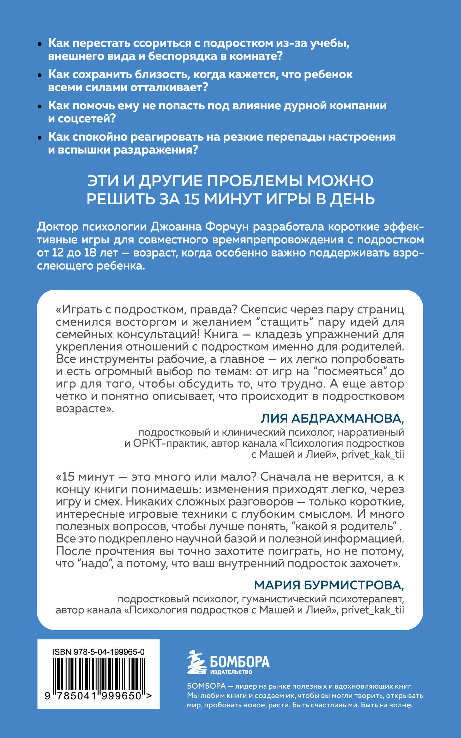 Когда ваш некогда ласковый и открытый ребенок вдруг превращается в замкнутого, раздражительного подростка, а любая попытка поговорить заканчивается ссорой и обидами - самое время восстановить контакт и укрепить доверие. Доктор психологии Джоанна Форчун предлагает простые и действенные игры для совместного времяпрепровождения с подростками 12-18 лет - в тот самый период, когда особенно важно сохранять связь и поддержку. Из этой книги вы узнаете: - Как говорить так, чтобы подросток не просто слушал, а слышал вас. - Как реагировать на грубость и закрытость без конфликтов. - Как помочь ребенку справляться с перепадами настроения. - Что делать, если вас тревожит дурная компания или влияние соцсетей. - Как сохранить близость, даже когда подросток всеми силами отталкивает вас. Эти и другие вопросы можно решить за 15 минут игры в день!| Издательство | ООО "Издательство "Эксмо" |