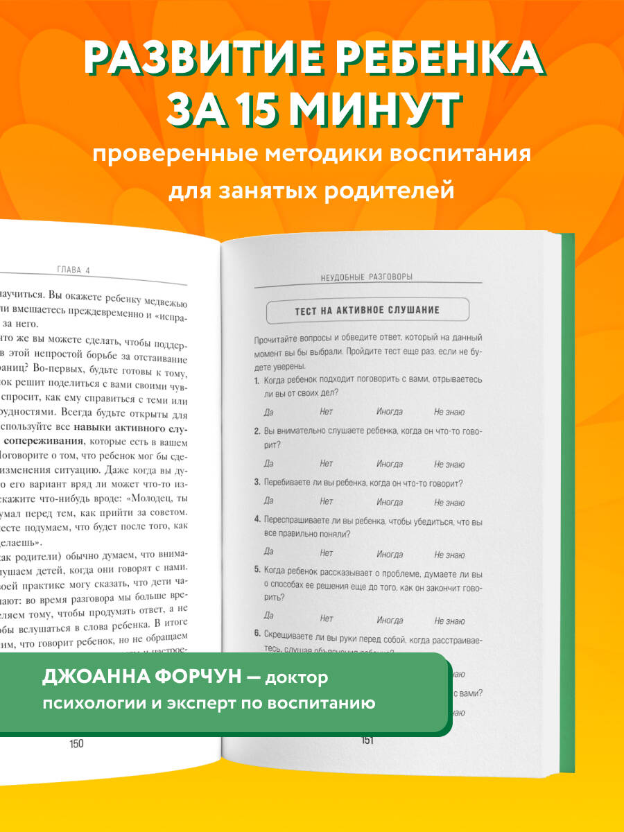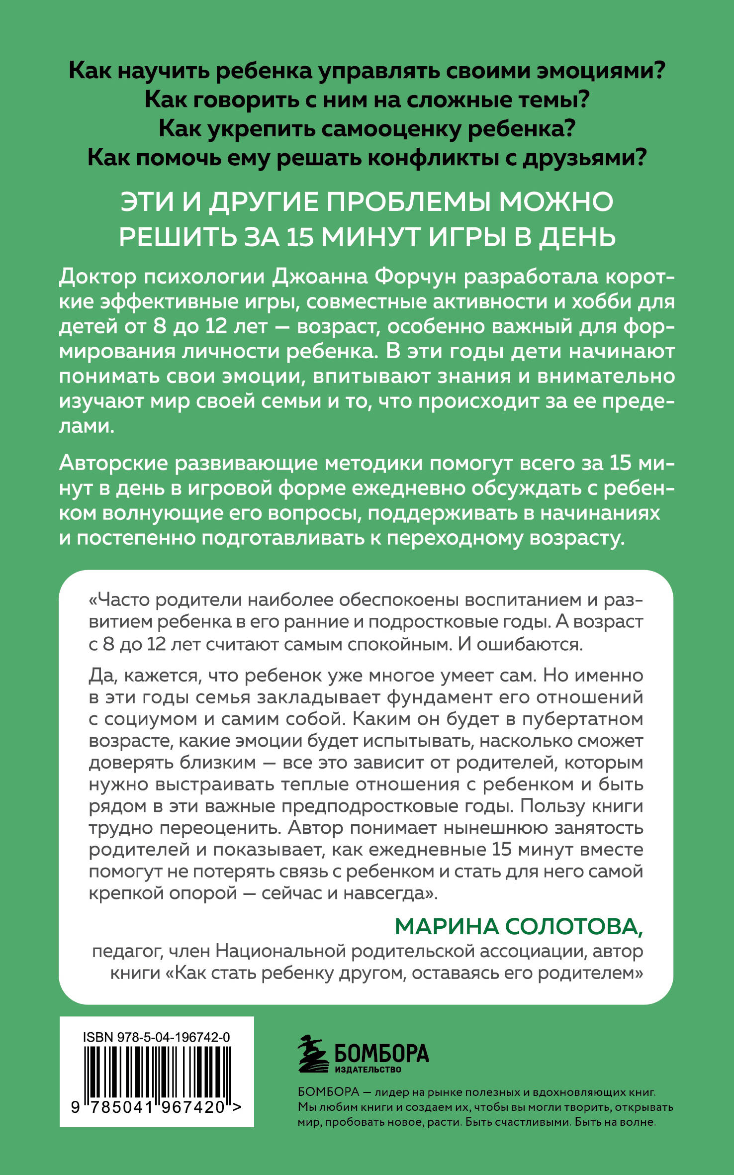 Доктор психологии Джоанна Форчун разработала короткие эффективные игры, совместные активности и хобби для особенных лет в формировании личности ребенка - от 8 до 12 лет. В эти годы дети начинают понимать свои эмоции, впитывают знания и внимательно изучают мир своей семьи и то, что происходит за ее пределами. Авторские развивающие методики помогут всего за 15 минут в день в игровой форме ежедневно обсуждать с ребенком волнующие его вопросы, поддерживать в начинаниях и постепенно подготавливать к переходному возрасту. - Как научить ребенка эмоциональной устойчивости? - Как говорить с ним на сложные темы? - Как укрепить самооценку ребенка? - Как помочь ему решать конфликты с друзьями? Эти и другие вопросы можно решить за 15 минут игры в день!| Издательство | ООО "Издательство "Эксмо" |