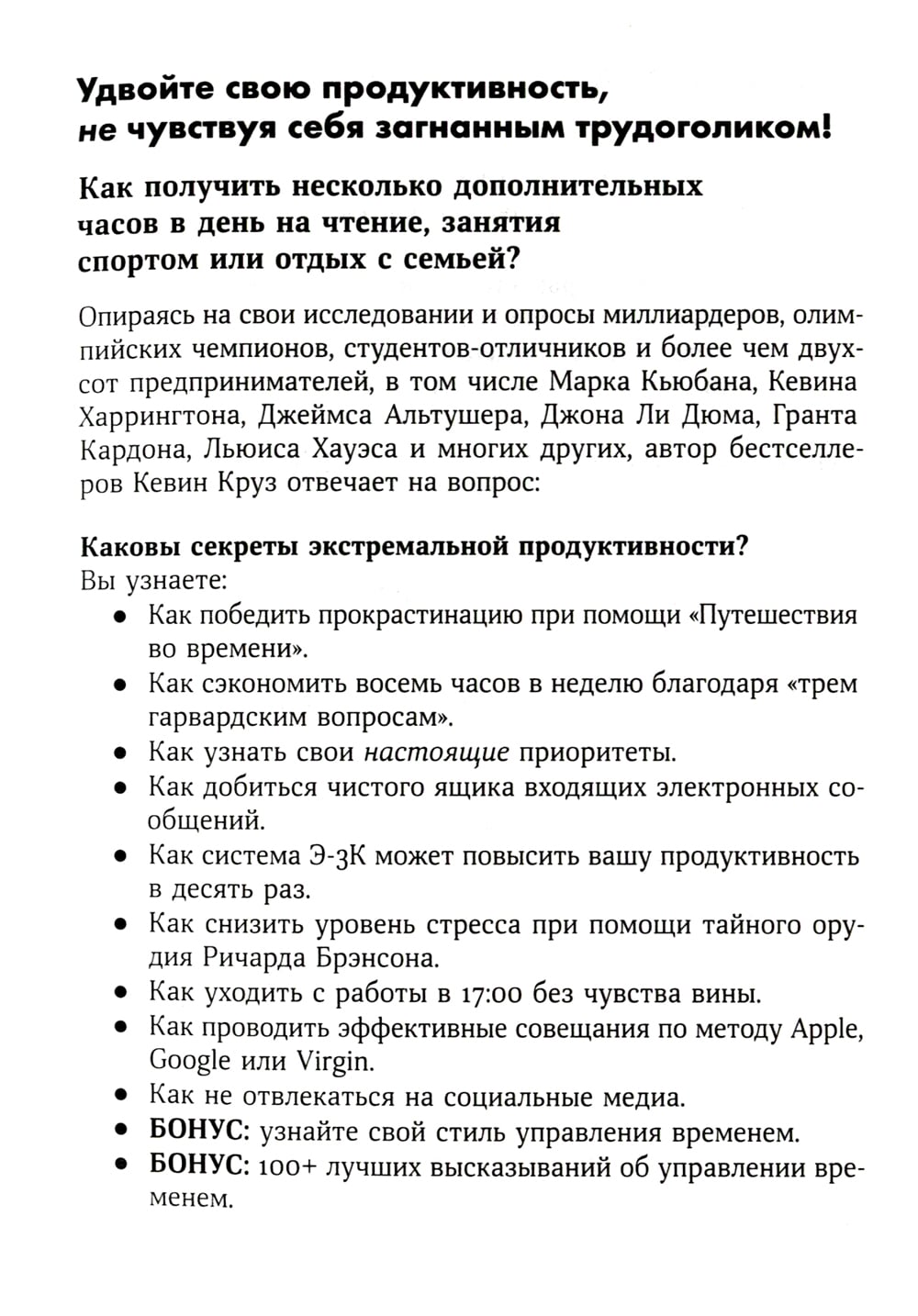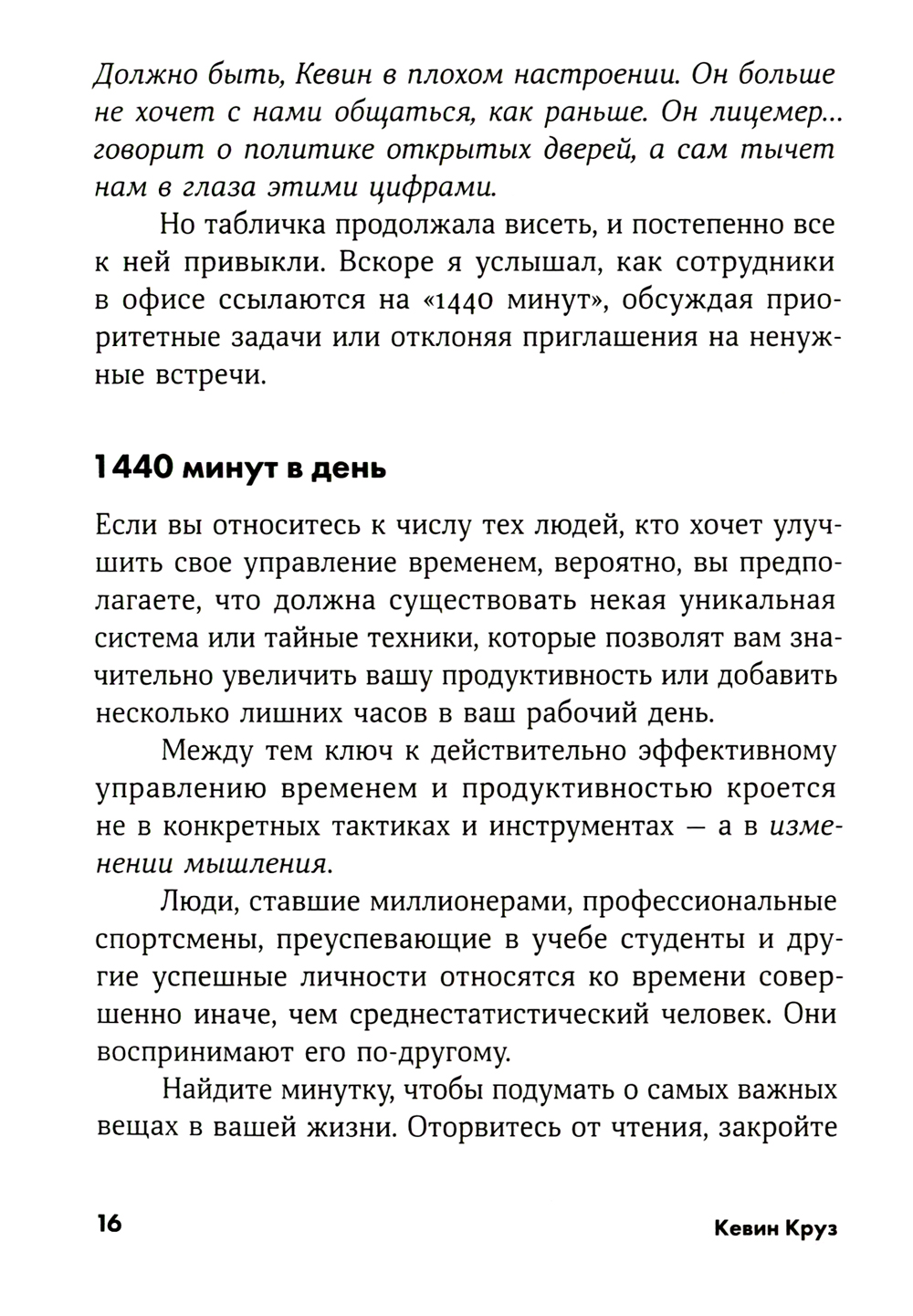 Что, если благодаря нескольким полезным привычкам у вас появится свободное время для чтения, тренировок и общения? Что, если вы сможете уходить с работы вовремя, не чувствуя вины за невыполненные задачи? Что, если вы станете успевать всё и у вас останется время на удовольствия, которых вы прежде не могли себе позволить? Именно так живут самые успешные люди: миллиардеры, предприниматели, олимпийские чемпионы. Они не составляют списки дел и не используют сложные техники тайм-менеджмента. В чем же секрет? Кевин Круз изучил привычки нескольких тысяч профессионалов и сформулировал основные принципы управления временем, которые приводят к успеху. Следуйте его советам, и вы сможете удвоить вашу продуктивность без переработок и перенапряжения.| Издательство | Альпина Паблишер |