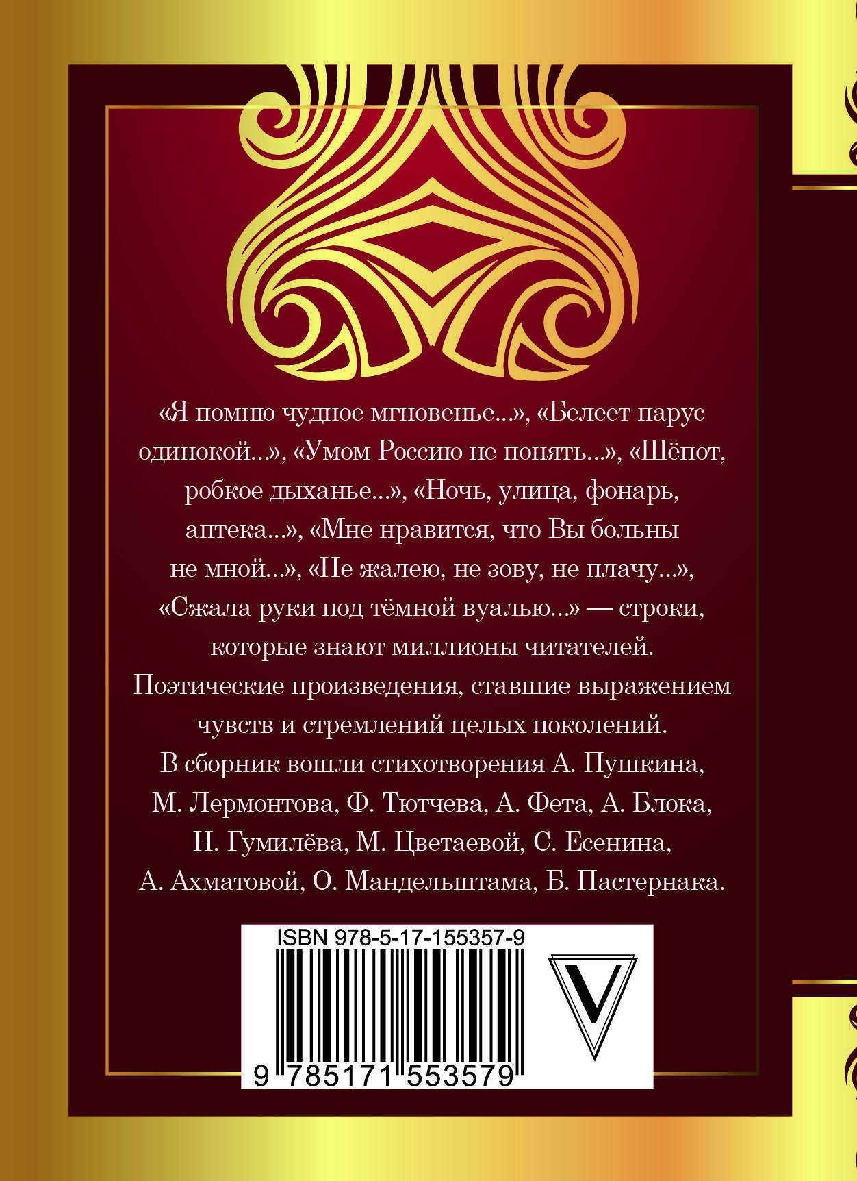 "Я помню чудное мгновенье...", "Белеет парус одинокой...", "Умом Россию не понять...", "Шепот, робкое дыханье...", "Ночь, улица, фонарь, аптека...", "Мне нравится, что Вы больны не мной...", "Не жалею, не зову, не плачу...", "Сжала руки под темной вуалью..." - строки, которые знают миллионы читателей. Поэтические произведения, ставшие выражением чувств и стремлений целых поколений. В сборник вошли стихотворения А. Пушкина, М. Лермонтова, Ф. Тютчева, А. Фета, А. Блока, Н. Гумилёва, М. Цветаевой, С. Есенина, А. Ахматовой, О. Мандельштама, Б. Пастернака.| Издательство | ИЗДАТЕЛЬСТВО "АСТ" |