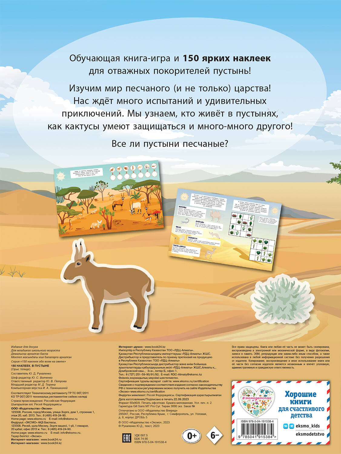 Перед вами увлекательная книга с наклейками, созданная специально для детей в возрасте от 4 до 7 лет. С ней дети отправятся в захватывающее путешествие по пустыне, где им предстоит использовать воображение и творческие способности. С помощью 150 ярких и красочных наклеек дети смогут оживить пустынный мир, создавая уникальные и забавные сцены. Эта книга не только развлечет детей, но и поможет развить их моторику, воображение и зрительное восприятие. Она отличается удобным форматом и качественными наклейками, которые легко приклеить и отклеить без повреждения страниц.| Издательство | ООО "Издательство "Эксмо" |