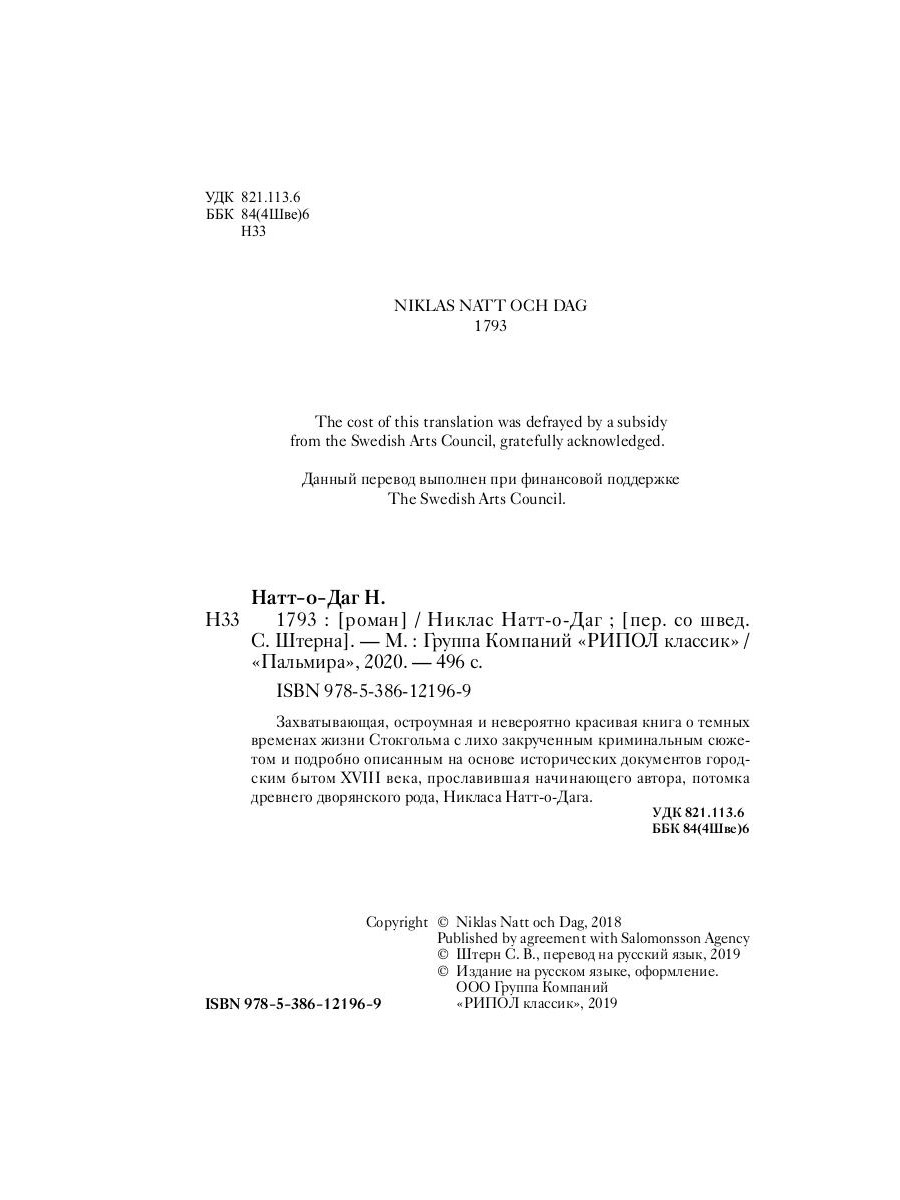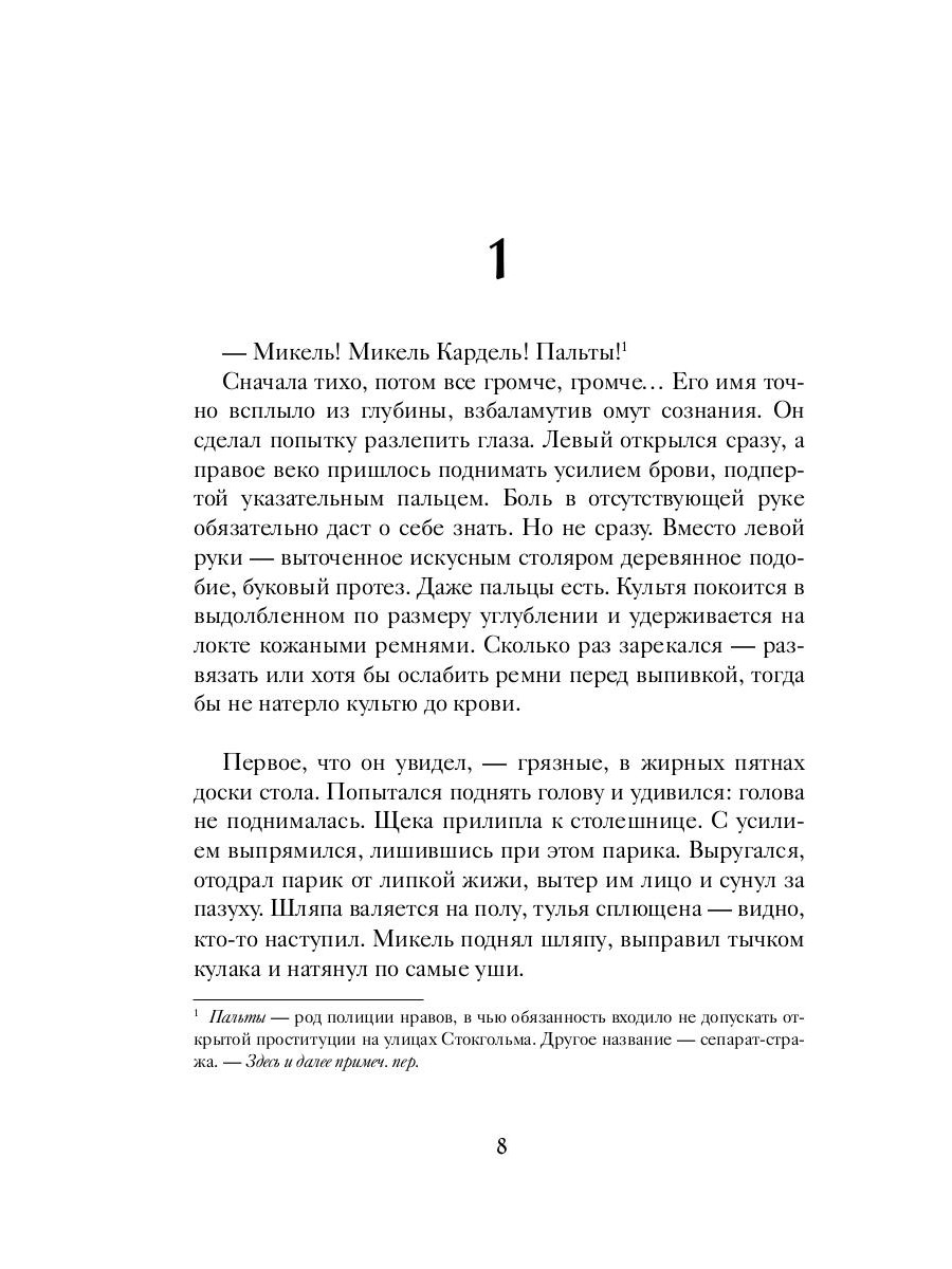 Захватывающая, остроумная и невероятно красивая книга о темных временах жизни Стокгольма с лихо закрученным криминальным сюжетом и подробно описанным на основе исторических документов городским бытом XVIII века, прославившая начинающего автора, потомка древнего дворянского рода, Никласа Натт-о-Дага.