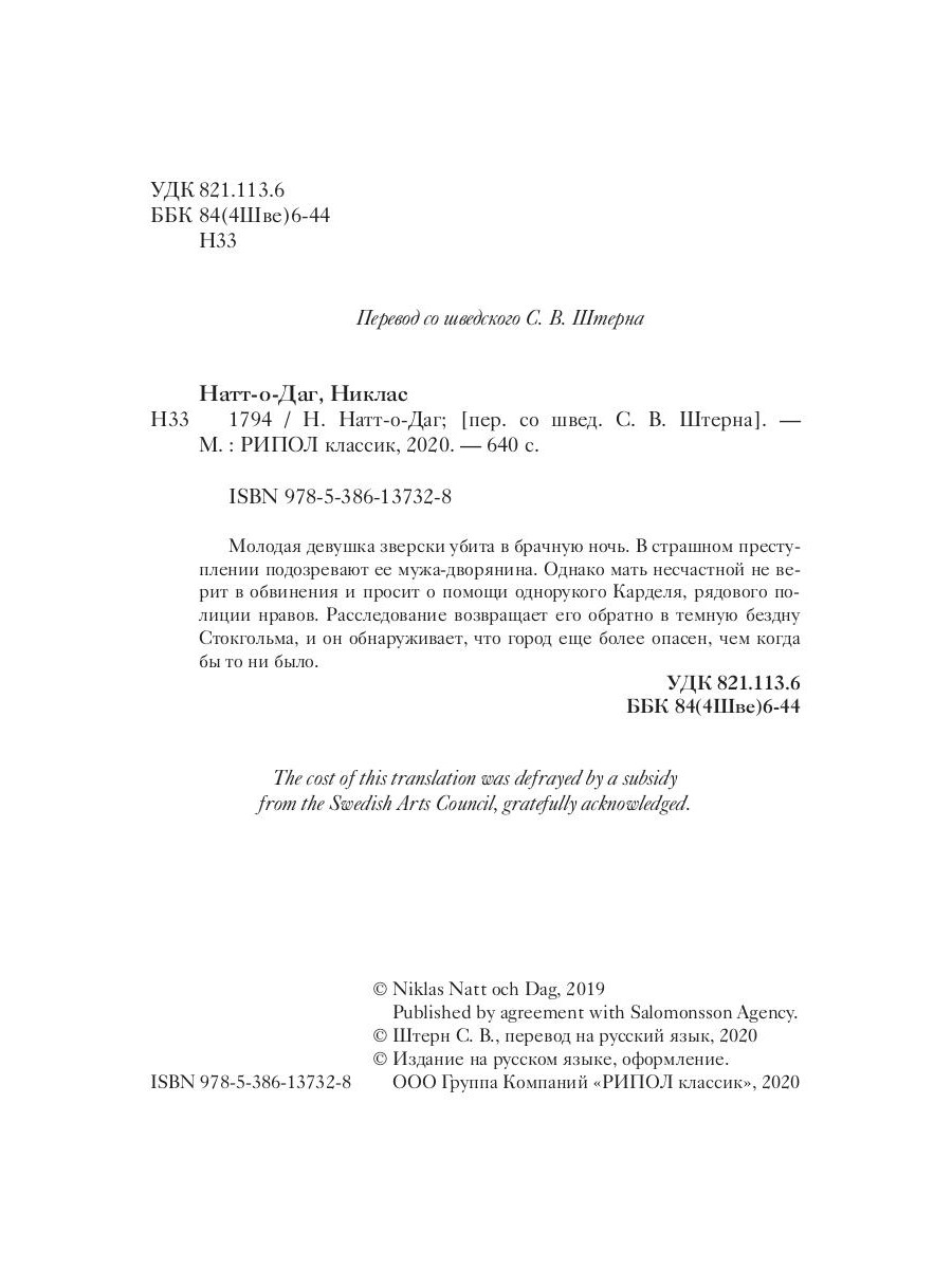 Молодая девушка зверски убита в брачную ночь. В страшном преступлении подозревают ее мужа-дворянина. Однако мать несчастной не верит в обвинения и просит о помощи однорукого Карделя, рядового полиции нравов. Расследование возвращает его обратно в темную бездну Стокгольма, и он обнаруживает, что город еще более опасен, чем когда бы то ни было.| Издательство | Рипол Классик |