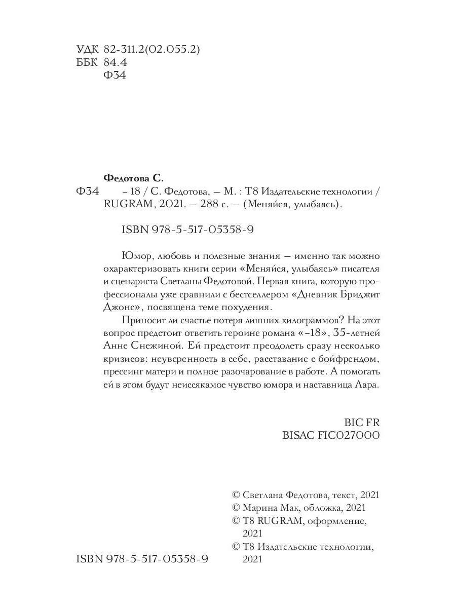 Юмор, любовь и полезные знания - именно так можно охарактеризовать книги серии «Меняйся, улыбаясь» писателя и сценариста Светланы Федотовой. Первая книга, которую профессионалы уже сравнили с бестселлером «Дневник Бриджит Джонс», посвящена теме похудения. Приносит ли счастье потеря лишних килограммов? На этот вопрос предстоит ответить героине романа -"18", 35-летней Анне Снежиной. Ей предстоит преодолеть сразу несколько кризисов: неуверенность в себе, расставание с бойфрендом, прессинг матери и полное разочарование в работе. А помогать ей в этом будут неиссякамое чувство юмора и наставница Лара.| Издательство | Т8 RUGRAM |