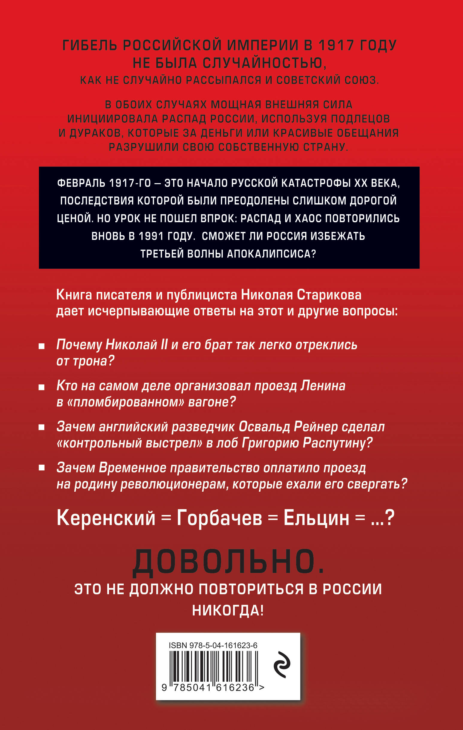 Гибель Российской империи в 1917 году не была случайностью, как не случайно рассыпался и Советский Союз. В обоих случаях мощная внешняя сила инициировала распад России, используя подлецов и дураков, которые за деньги или красивые обещания разрушили свою собственную страну. Февраль 1917-го - это начало русской катастрофы ХХ века, последствия которой были преодолены слишком дорогой ценой. Но урок не пошел впрок: распад и хаос повторились вновь в 1991 году. Сможет ли Россия избежать третьей волны апокалипсиса? Книга писателя и публициста Николая Старикова дает исчерпывающие ответы на этот и другие вопросы: - Почему Николай II и его брат так легко отреклись от трона? - Кто на самом деле организовал проезд Ленина в «пломбированном» вагоне? - Зачем английский разведчик Освальд Рейнер сделал «контрольный выстрел» в лоб Григорию Распутину? - Зачем Временное правительство оплатило проезд на родину революционерам, которые ехали его свергать? Керенский = Горбачев = Ельцин = ...? Довольно. Это не должно повториться в России никогда! Николай Стариков - один из самых известных публицистов в России, автор 20 бестселлеров («Сталин после войны», «Война. Чужими руками», «Национализации рубля» и многих других).| Издательство | Эксмо |
