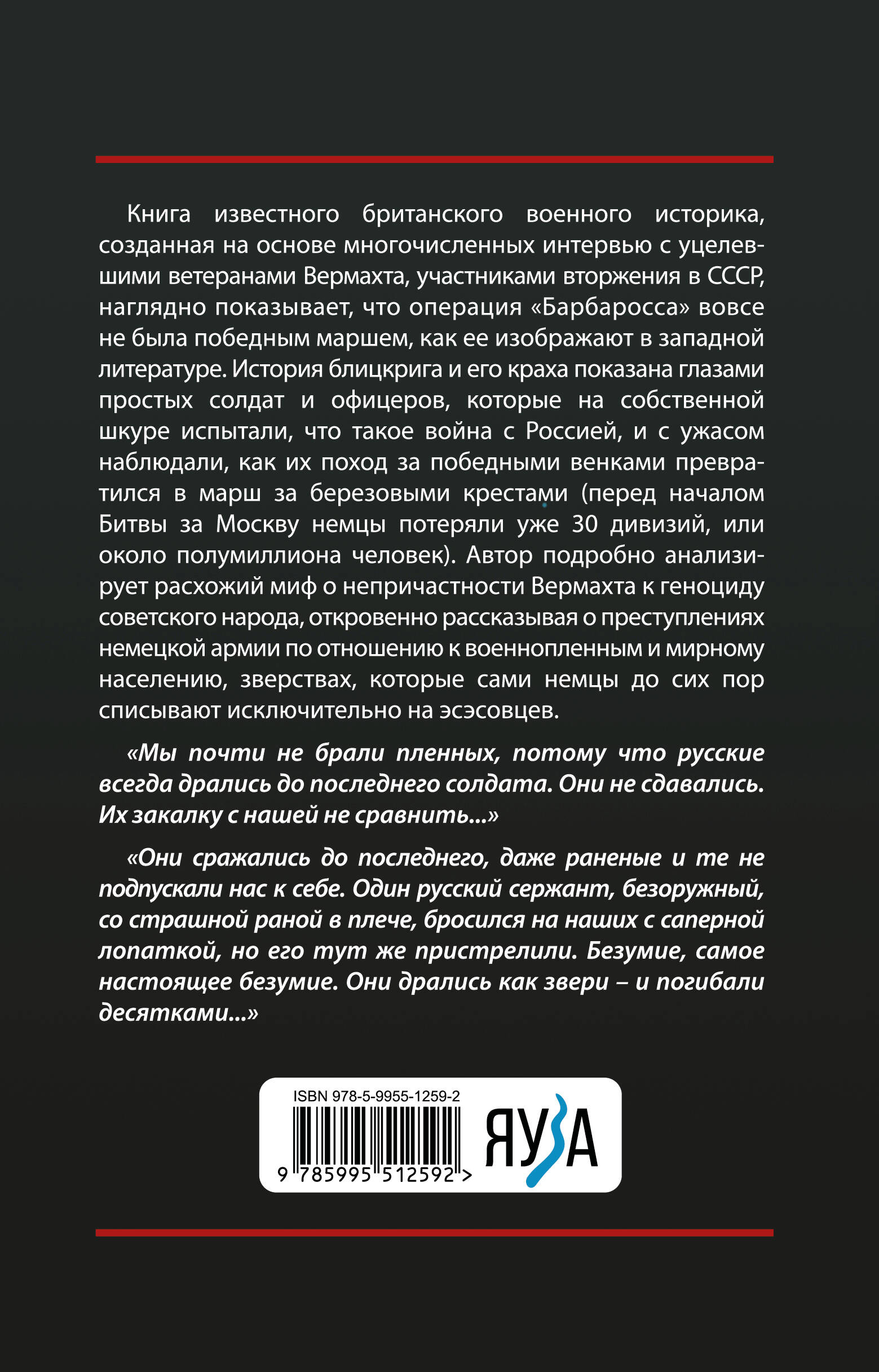 Книга известного британского военного историка, созданная на основе многочисленных интервью с уцелевшими ветеранами Вермахта, участниками вторжения в СССР, наглядно показывает, что операция "Барбаросса" вовсе не была победным маршем, как ее изображают в западной литературе. История блицкрига и его краха показана глазами простых солдат и офицеров, которые на собственной шкуре испытали, что такое война с Россией, и с ужасом наблюдали, как их поход за победными венками превратился в марш за березовыми крестами (перед началом Битвы за Москву немцы потеряли уже 30 дивизий, или около полумиллиона человек). Автор подробно анализирует расхожий миф о непричастности Вермахта к геноциду советского народа, откровенно рассказывая о преступлениях немецкой армии по отношению к военнопленным и мирному населению, зверствах которые сами немцы до сих пор списывают исключительно на эсэсовцев.| Издательство | Яуза-пресс ООО |