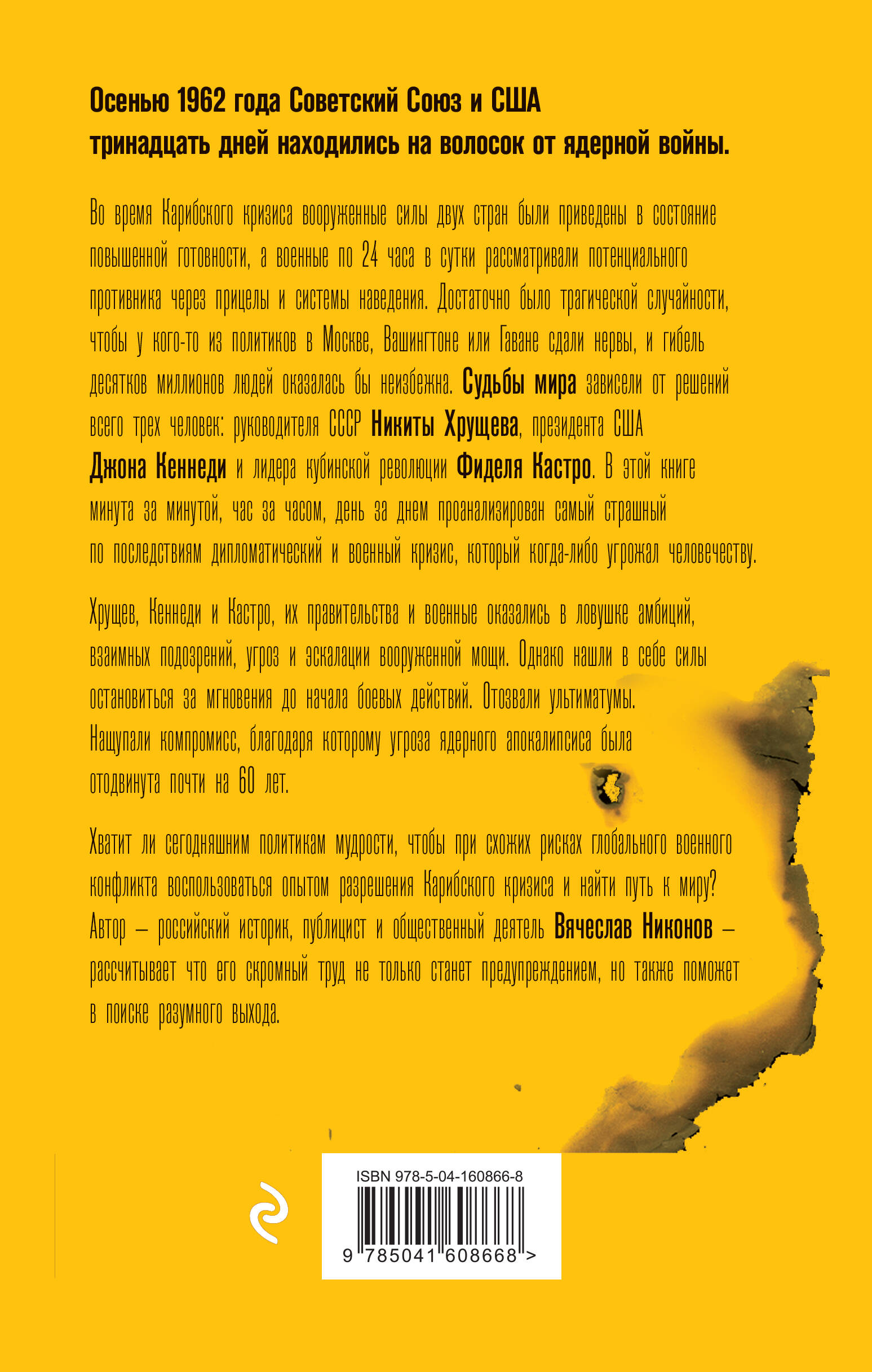 Осенью 1962 года Советский Союз и США тринадцать дней находились на волосок от ядерной войны. Во время Карибского кризиса вооруженные силы двух стран были приведены в состояние повышенной готовности, а военные по 24 часа в сутки рассматривали потенциального противника через прицелы и системы наведения. Достаточно было трагической случайности, чтобы у кого-то из политиков в Москве, Вашингтоне или Гаване сдали нервы, и гибель десятков миллионов людей оказалась бы неизбежна. Судьбы мира зависели от решений всего трех человек: руководителя СССР Никиты Хрущева, президента США Джона Кеннеди и лидера кубинской революции Фиделя Кастро. В этой книге минута за минутой, час за часом, день за днем проанализирован самый страшный по возможным последствиям дипломатический и военный кризис, который когда-либо угрожал человечеству. Хрущев, Кеннеди и Кастро, их правительства и военные оказались в ловушке амбиций, взаимных подозрений, угроз и эскалации вооруженной мощи. Однако нашли в себе силы остановиться за мгновения до начала боевых действий. Отозвали ультиматумы. Нащупали компромисс, благодаря которому угроза ядерного апокалипсиса была отодвинута почти на 60 лет. Хватит ли сегодняшним политикам мудрости, чтобы при схожих рисках глобального военного конфликта воспользоваться опытом разрешения Карибского кризиса и найти путь к миру? Автор - российский историк, публицист и общественный деятель Вячеслав Никонов - рассчитывает, что его скромный труд не только станет предупреждением, но также поможет в поиске разумного выхода.