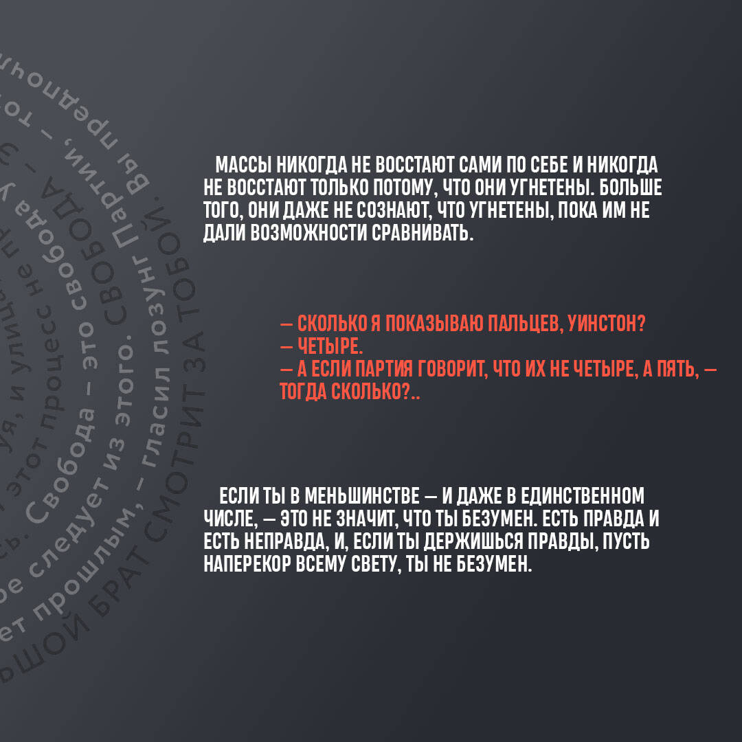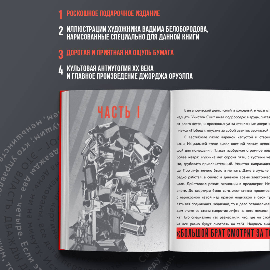 Культовая антиутопия XX века и главное произведение Джорджа Оруэлла заиграет новыми красками благодаря иллюстрациям художника Вадима Белобородова, нарисованным специально для данного издания. Макет книги органично поддерживает иллюстрации: красивый, простой, жесткий, как и сам роман.