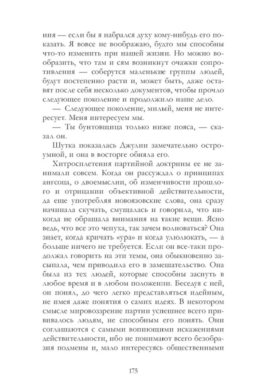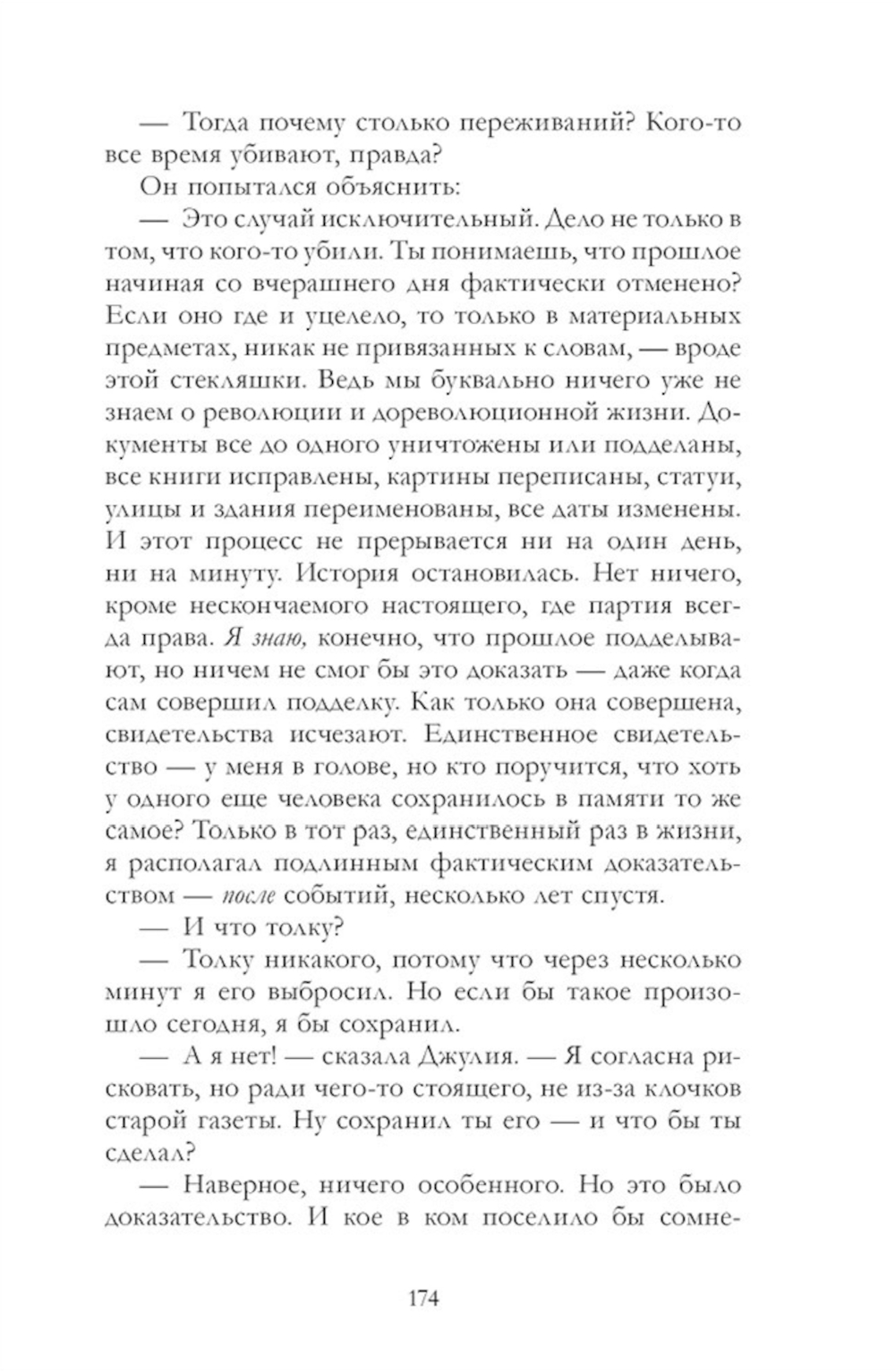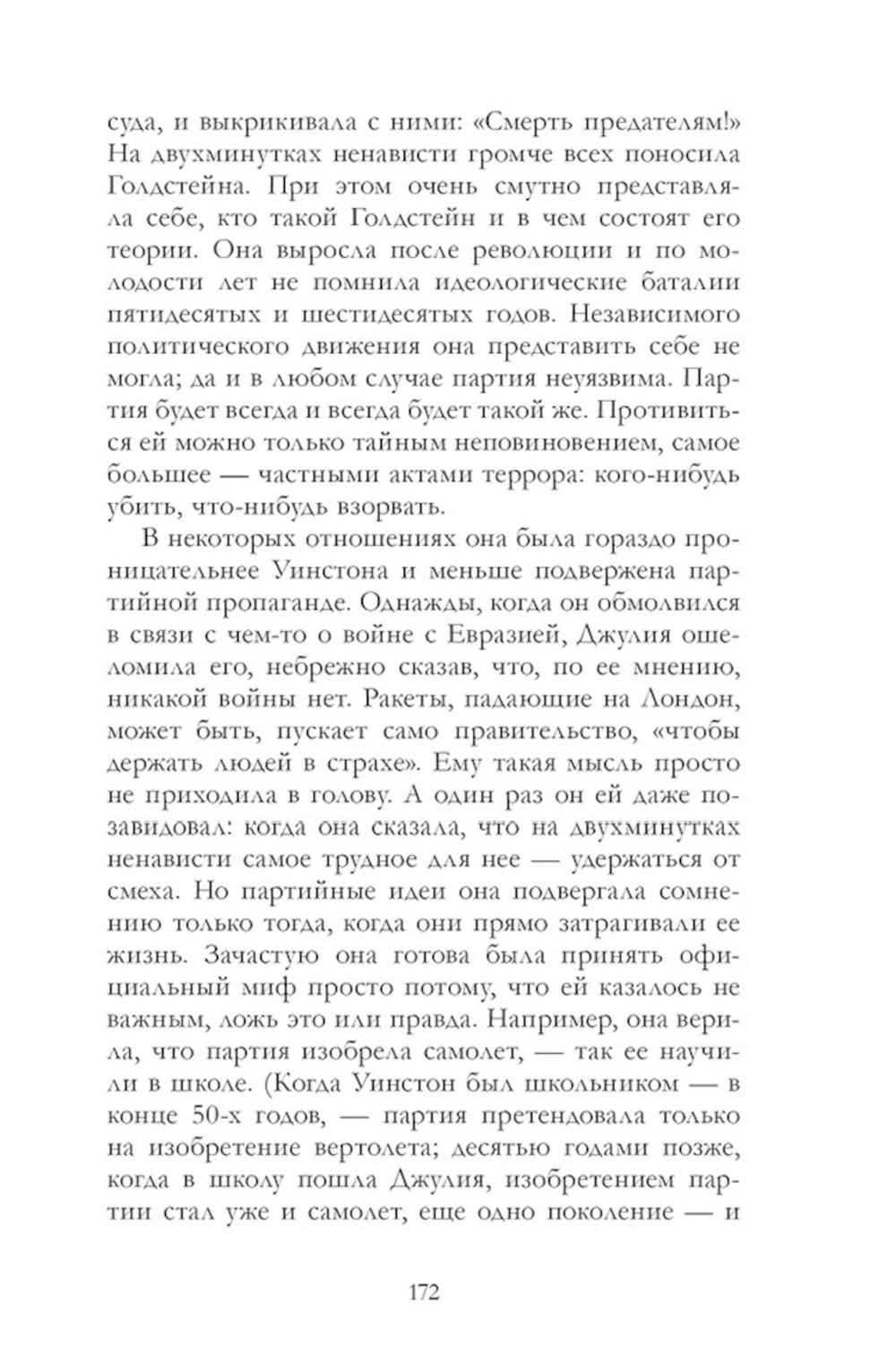 Роман «1984» - одна из самых знаменитых антиутопий XX века, история, разворачивающаяся в тоталитарном обществе, где каждое действие и мысль граждан контролируются Партией и ее лидером, Большим Братом. Главный герой, Уинстон Смит, работает в Министерстве правды, переписывая историю в угоду режиму, но внутри него разгорается бунт против подавляющего государства. В поисках свободы и любви он сталкивается с жестокими реалиями своей эпохи. В книге «1984» Оруэлл показывает, что нет и не может быть ничего ужаснее тотальной несвободы: если Старший Брат смотрит на тебя и заявляет, что дважды два - пять, значит, так и есть. Тоталитаризм уничтожает в человеке все духовные потребности, мысли, чувства и сам разум, оставляя лишь постоянный страх и единственный выбор - между молчанием и смертью. Публикуется в классическом переводе Виктора Голышева.| Издательство | Клевер-Медиа-Групп |
