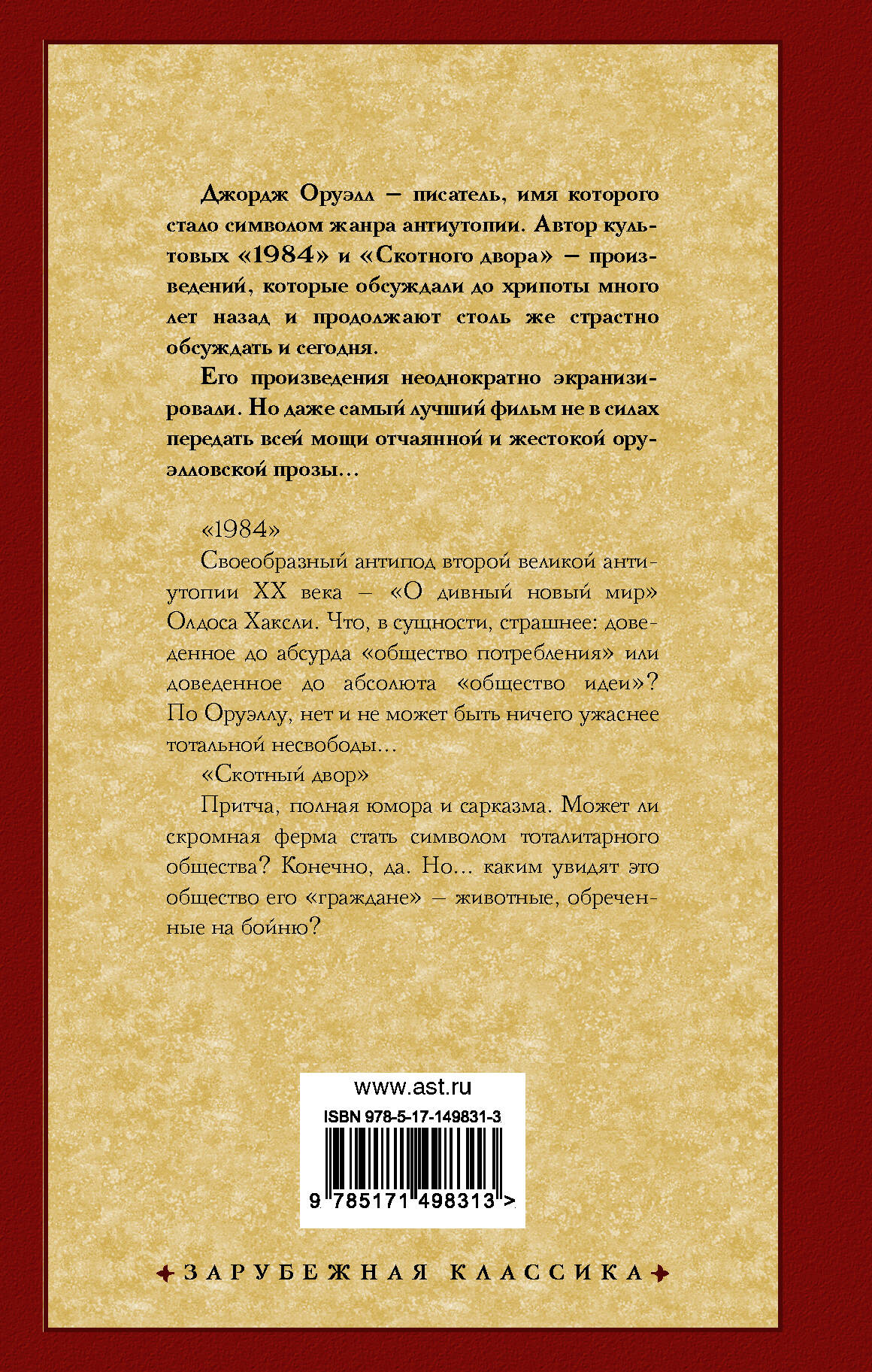 Два легендарных произведения Джорджа Оруэлла под одной обложкой! «1984» - одна из великих антиутопий XX века, не утратившая актуальности и спустя 75 лет после написания. В этом издании «1984» публикуется в новом полном, без цензуры и купюр, переводе Дарьи Целовальниковой. "1984". Своеобразный антипод второй великой антиутопии XX века - "О дивный новый мир" Олдоса Хаксли. Что, в сущности, страшнее: доведенное до абсурда "общество потребления" - или доведенное до абсолюта "общество идеи"? По Оруэллу, нет и не может быть ничего ужаснее тотальной несвободы... "Скотный двор". Притча, полная юмора и сарказма. Может ли скромная ферма стать символом тоталитарного общества? Конечно, да. Но... каким увидят это общество его "граждане" - животные, обреченные на бойню?| Издательство | АСТ |
