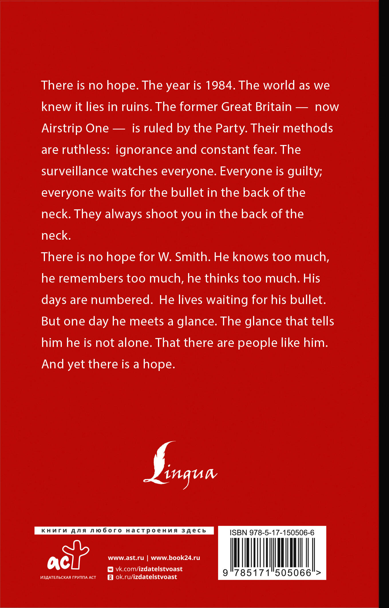 Издание на английском языке. Потеряли правду в море лжи? Не знаете, кому доверять? С экранов на вас льются потоки ненависти? Добро пожаловать в "1984". В ваших руках руководство по выживанию в мире официально установленного двоемыслия. В мире, где дважды два равно пяти. В мире, где нет ни прошлого, ни будущего, есть только уродливое настоящее. Джордж Оруэлл - английский писатель и журналист, социалист, воевавший против фашистов в Испании. В далеком 1949 г. он написал визионерскую антиутопию "1984" - одну из самых продаваемых книг нашего времени. Её мир - это мир элиты, насаждающей невежество. Её контроль над человеком полон и целен. Даже неортодоксальные мысли в этом обществе запрещены. Согрешившие мыслью отправляются на перевоспитание в мрачные застенки Министерства Любви. Главный герой - один из тех несчастных, что слишком привязаны к миру прошлого. Дни таких, как он, сочтены. Зная это, он решается на отчаянный бунт в обществе непререкаемой догмы - завести дневник. Этот дневник расскажет о днях последнего человека в Европе, осмелившегося мечтать и любить. Книга издана в неадаптированной версии. Наслаждаясь языком и новоязом Дж. Оруэлла в оригинале, не забывайте, что БОЛЬШОЙ БРАТ ПРИСМАТРИВАЕТ ЗА ВАМИ.| Издательство | АСТ |
