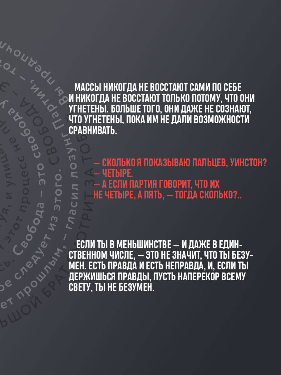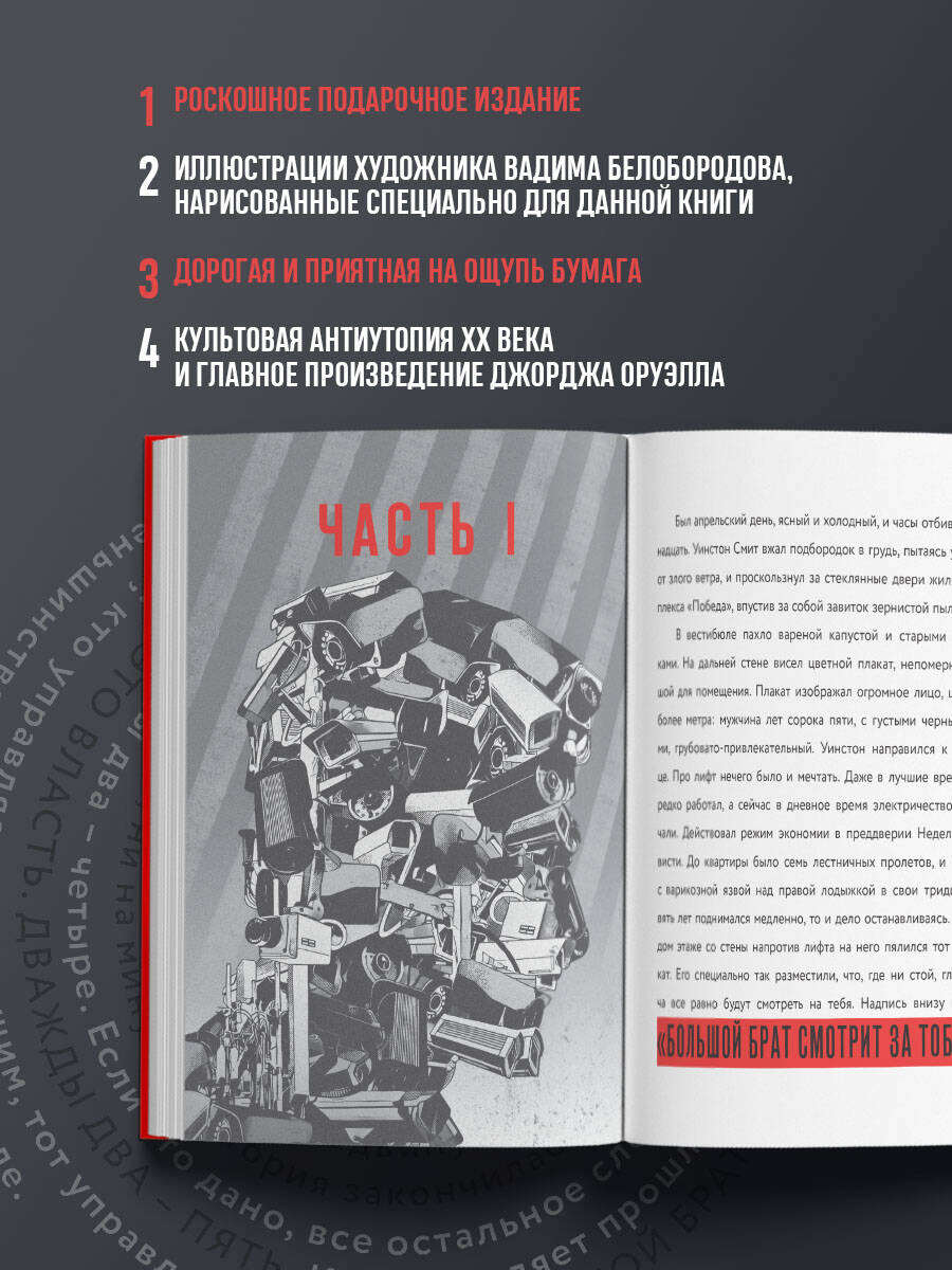 Джордж Оруэлл - один из самых читаемых в мире авторов и очень противоречивая персона своего времени. Родился в Бенгалии, учился в Итоне, работал в полиции, на радио и в букинистическом магазине, воевал в Испании и писал книги. Ярый противник коммунизма и защитник демократического социализма, Оруэлл устроил бунт против общества, к которому так стремился, но в котором чувствовал себя абсолютно чужим. Что будет, если в правящих кругах распространятся идеи фашизма и диктатуры? Каким станет общественный уклад, если власть потребует неуклонного подчинения? К какой катастрофе приведет подобный режим? В государстве Океания у граждан нет прав, а значит, власть партии абсолютна. Повседневная жизнь героев проходит в условиях страха и постоянных потрясений. Здесь перечеркнуты свобода слова, свобода печати, свобода выбора, свобода любви и даже свобода мысли. Нарушить порядок невозможно, ведь Большой Брат смотрит за каждым. Ужасы преступлений государственной машины зафиксировал Джордж Оруэлл в своем главном творении - «1984». Этот роман-предупреждение об опасности тоталитаризма стал одной из самых известных антиутопий XX века, которая стоит в одном ряду с «Мы» Замятина, «О дивный новый мир» Хаксли и «451° по Фаренгейту» Брэдбери. Культовая антиутопия XX века и главное произведение Джорджа Оруэлла заиграет новыми красками благодаря иллюстрациям художника Вадима Белобородова, нарисованным специально для данного издания. Макет книги органично поддерживает иллюстрации: красивый, простой, жесткий, как и сам роман.| Издательство | ООО "Издательство "Эксмо" |
