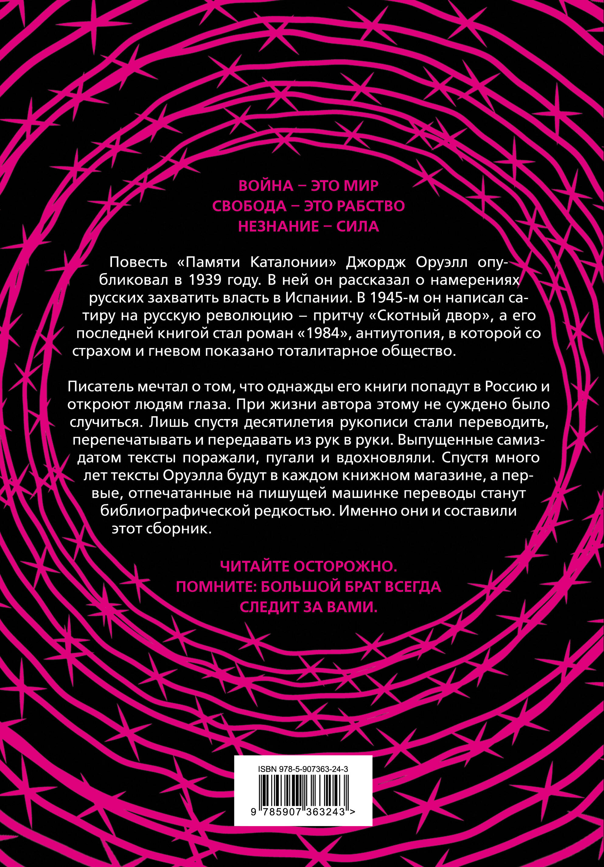 Писатель мечтал о том, что однажды его книги попадут в Россию и откроют людям глаза. При жизни автора этому не суждено было случиться. Лишь спустя десятилетия рукописи стали переводить, перепечатывать и передавать из рук в руки. Выпущенные самиздатом тексты поражали, пугали и вдохновляли. Спустя много лет тексты Оруэлла будут в каждом книжном магазине, а первые, отпечатанные на пишущей машинке, переводы станут библиографической редкостью. Именно они и составили этот сборник. Читайте осторожно. Помните, Большой брат всегда следит за вами.