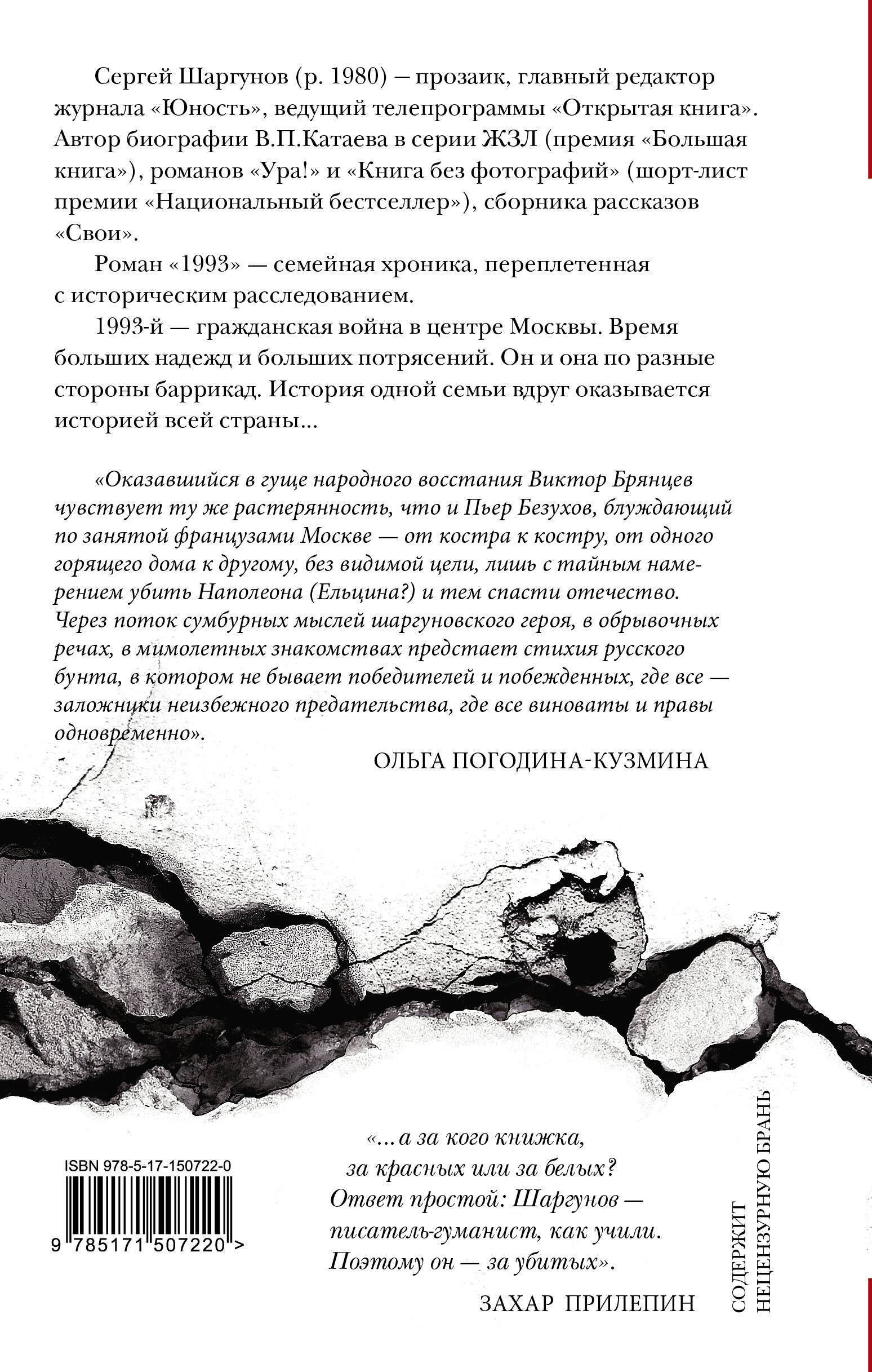 Новое издание романа «1993» Сергея Шаргунова, лауреата премии «Большая книга». Свидетель истории: «семейный портрет на фоне горящего дома». Автор застал лично описанные им события, а затем в 1998-1999 гг. работал в комиссии по расследованию событий 21 сентября - 4 октября 1993 года. Актуальная книга. События 1993 года мало представлены в современном сознании. Но именно в этом году кроется исток многих общественных конфликтов, актуальных в наши дни. Роман Шаргунова позволяет глубже проникнуть в ткань истории, проследить причины и следствия произошедших событий. Фотографическая точность. Сергею Шаргунову удается документально точно описать не только штурм Белого дома и телецентра Останкино, но и быт того времени. Ностальгическое и в то же время безжалостно точное повествование с первых страниц погружает читателя в ту эпоху.| Издательство | АСТ |