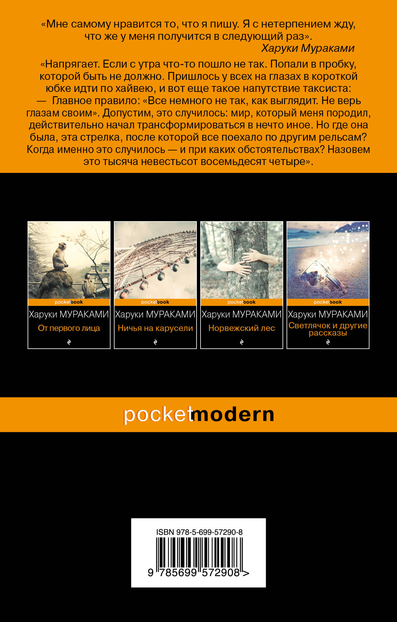 «Мне самому нравится то, что я пишу. Я с нетерпением жду, что же у меня получится в следующий раз». Харуки Мураками - абсолютный мастер слова и легенда современной литературы. Его романы, рассказы и эссе переведены на множество языков, они отмечены многочисленными мировыми премиями. Напрягает. Если с утра что-то пошло не так. Попали в пробку, которой быть не должно. Пришлось у всех на глазах в короткой юбке идти по хайвэю, и вот еще такое напутствие таксиста: - Главное правило: «Все немного не так, как выглядит. Не верь глазам своим». Допустим, это случилось: мир, который меня породил, действительно начал трансформироваться в нечто иное. Но где она была, эта стрелка, после которой все поехало по другим рельсам? Когда именно это случилось - и при каких обстоятельствах? Назовем это тысяча невестьсот восемьдесят четыре. И запишем: 1Q84. «Q» - как английское Question. Кью! Для пущей сомнительности.